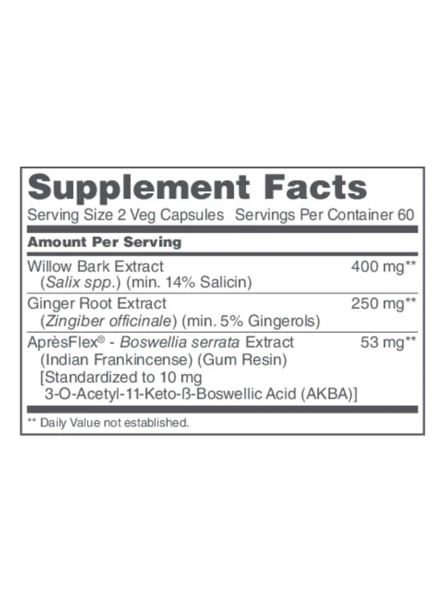 This formula includes Willow Bark Extract, Ginger Root Extract, and AprèsFlex® – Boswellia serrata Extract, which work synergistically to support joint health and manage discomfort.