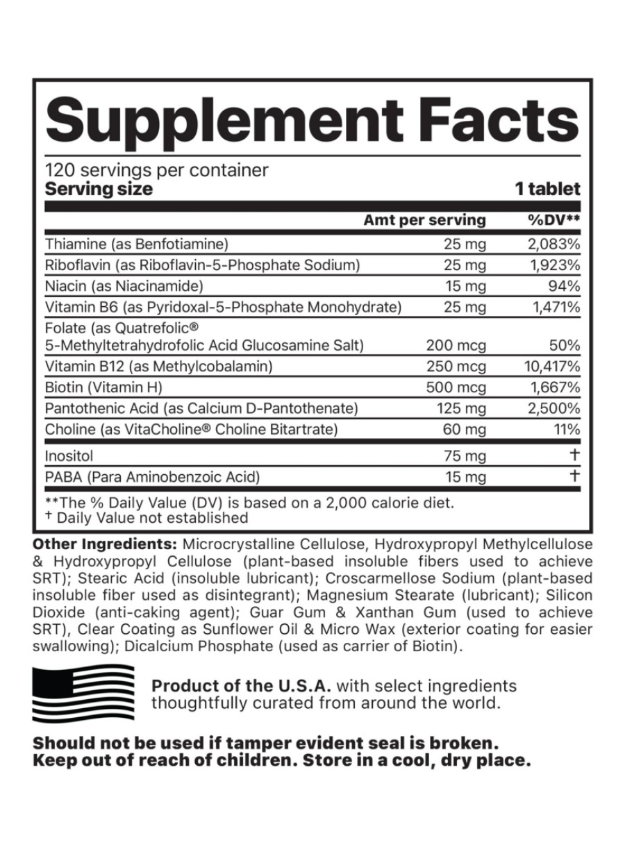 This supplement features a blend of active B vitamins, including benfotiamine, riboflavin 5-phosphate, niacinamide, and methylcobalamin, which are readily absorbed by the body, promoting overall health and vitality.