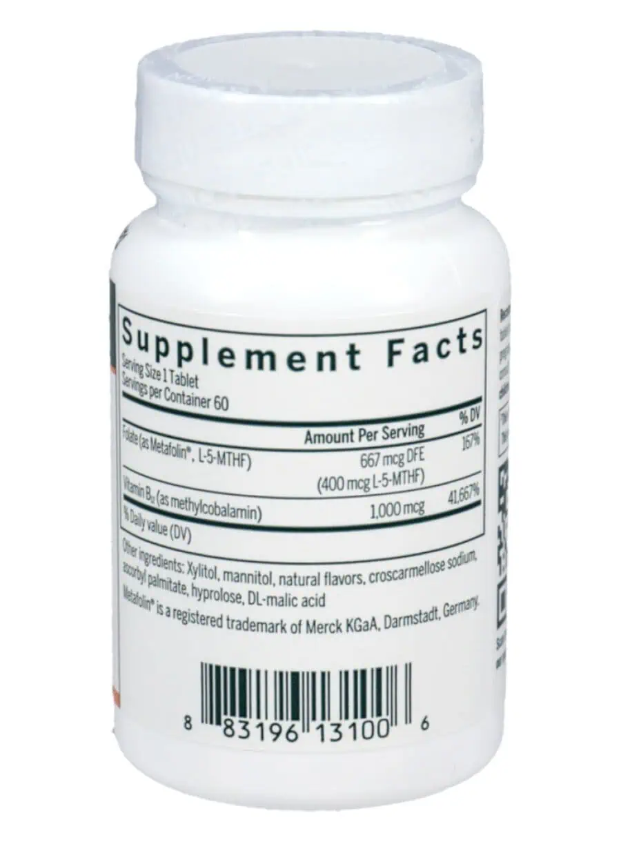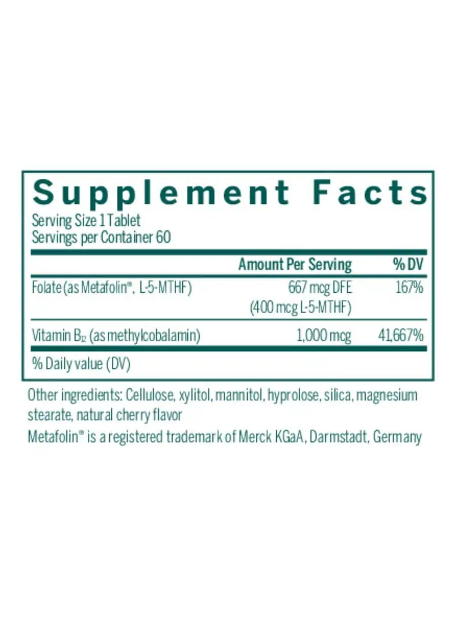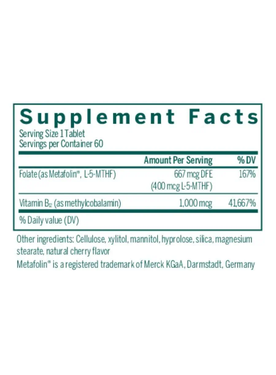 Active Chewable B12 + Methylfolate — This convenient chewable tablet combines Vitamin B12 and L-methylfolate to support normal macronutrient metabolism and red blood cell formation. With a delicious natural cherry flavor, it provides 1,000 mcg of methylcobalamin, an active form of Vitamin B12, and 400 mcg of Metafolin® (L-methylfolate), an active form of folate, making it ideal for adults and children aged 4 and older.