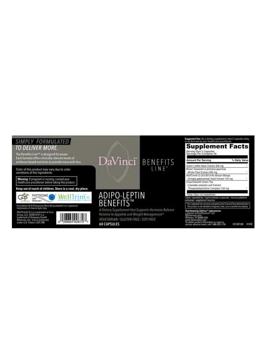 Adipo-Leptin Benefits — To provide the most comprehensive support for weight management, you need more than the standard metabolic health support. Special attention should be paid to the endocrine aspects of metabolism and appetite, in addition to normal fat absorption, use, and storage. Supporting a healthy balance of leptin and ghrelin is essential to providing a long-term weight management strategy. Adipo-Leptin Benefits™ offers the right evidence-based ingredients to make that strategy work. With green coffee bean extract, brown seaweed, WellTrim® iF (IGOB131®) African Mango seed extract, and GreenSelect® Phytosome™, Adipo-Leptin Benefits™ has everything you need to break through weight loss barriers.