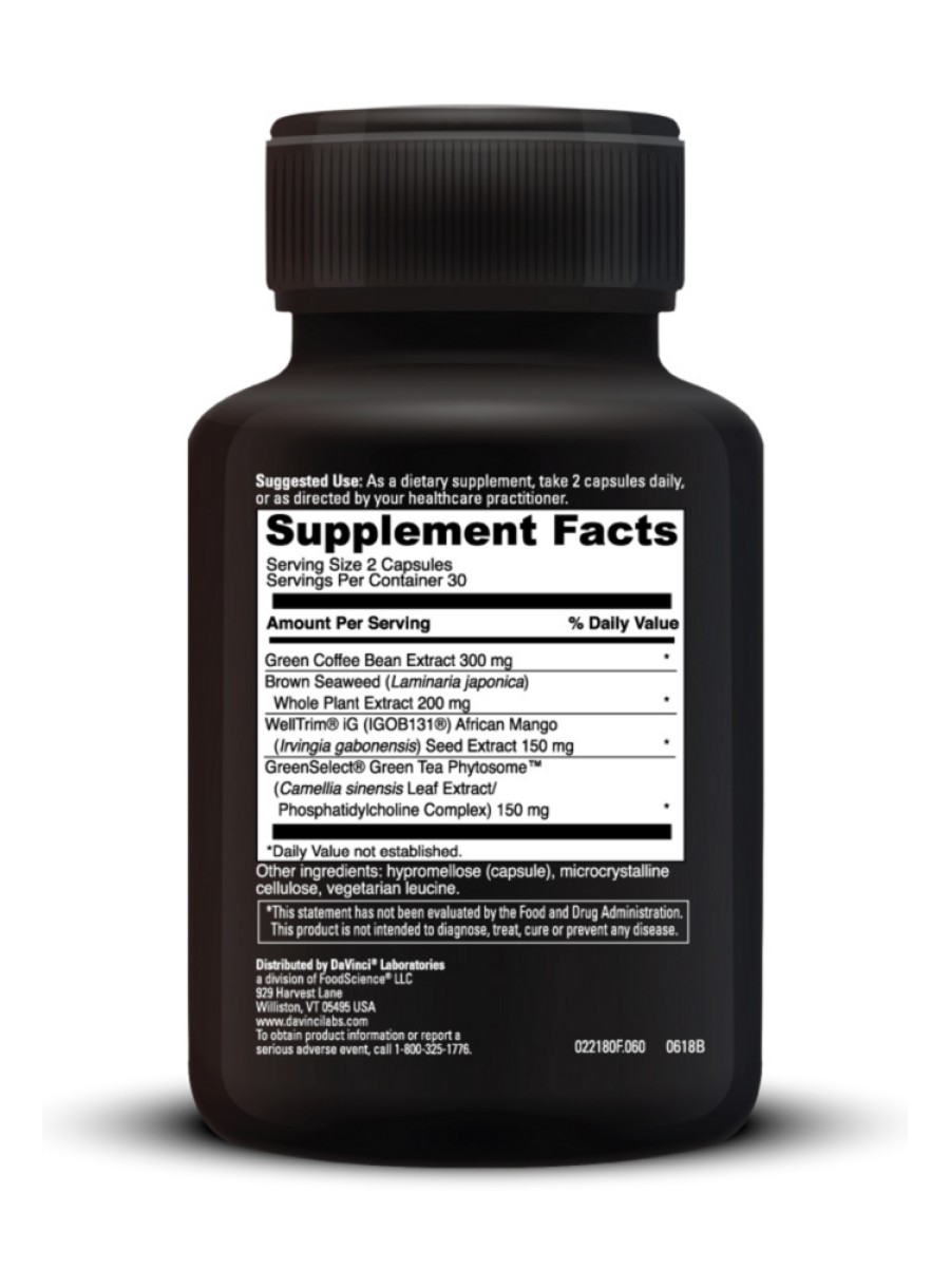 This formula combines green coffee bean extract, brown seaweed, African Mango seed extract, and GreenSelect® Phytosome™ to support metabolic health and appetite regulation.