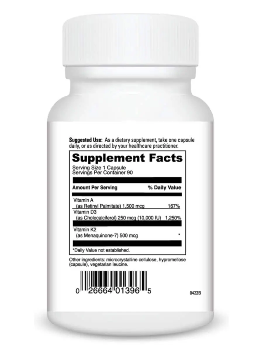 Vitamin A (as Retinyl Palmitate) is essential for vision and immune health, while Vitamin D3 (as Cholecalciferol) aids in calcium absorption and bone strength. Vitamin K2 (as Menaquinone-7) plays a crucial role in blood clotting and bone metabolism.
