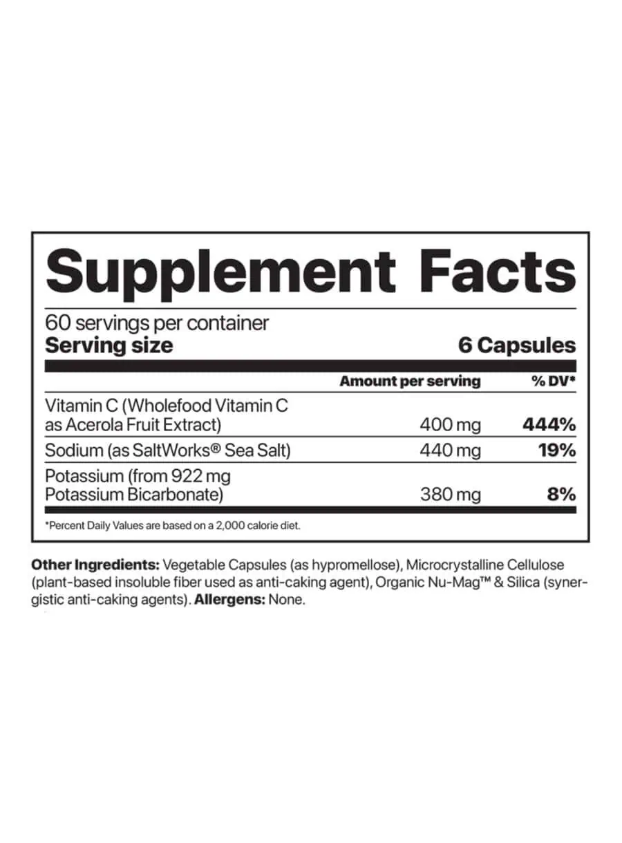 This supplement features Whole Food Vitamin C from Acerola Fruit Extract, along with Potassium Bicarbonate and Sea Salt, which are vital for adrenal health and hormone production.