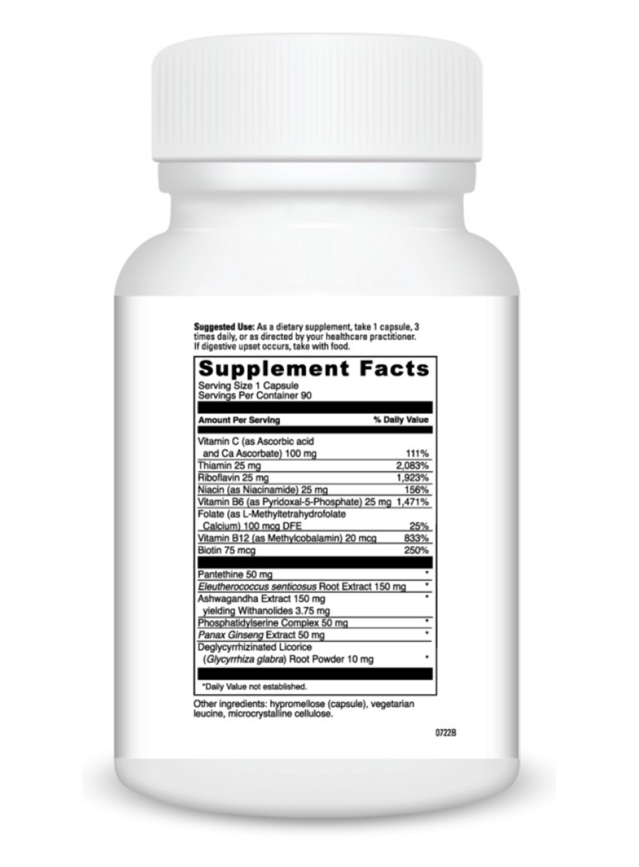This advanced formula includes vitamins and adaptogens such as Pantethine, B Vitamins, and Phosphatidylserine, which work synergistically to support adrenal health and reduce stress reactions.