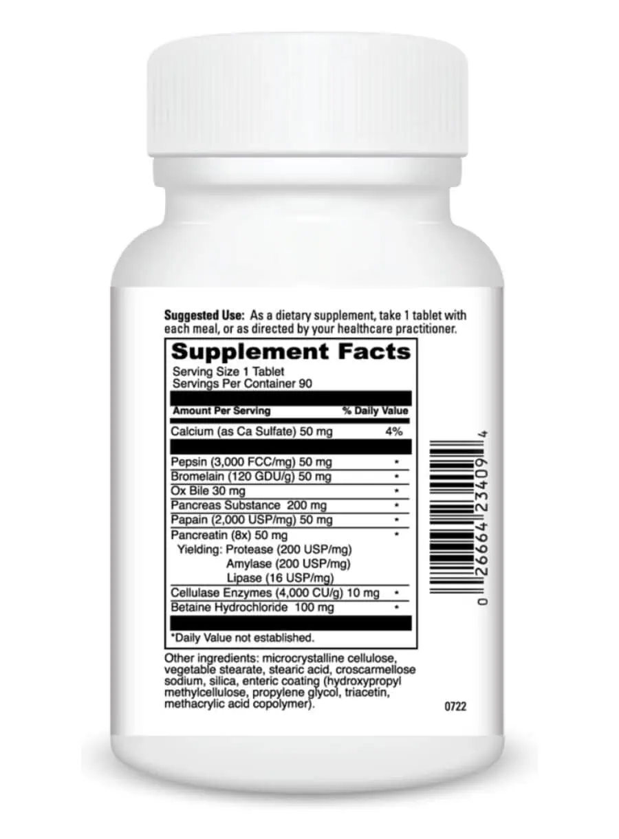 This enzyme supplement features lipase for fat digestion, proteases like bromelain and pepsin for protein breakdown, amylase for carbohydrate digestion, and cellulase for fiber digestion. Additionally, ox bile aids in fat emulsification, while betaine hydrochloride supports the overall function of digestive enzymes.