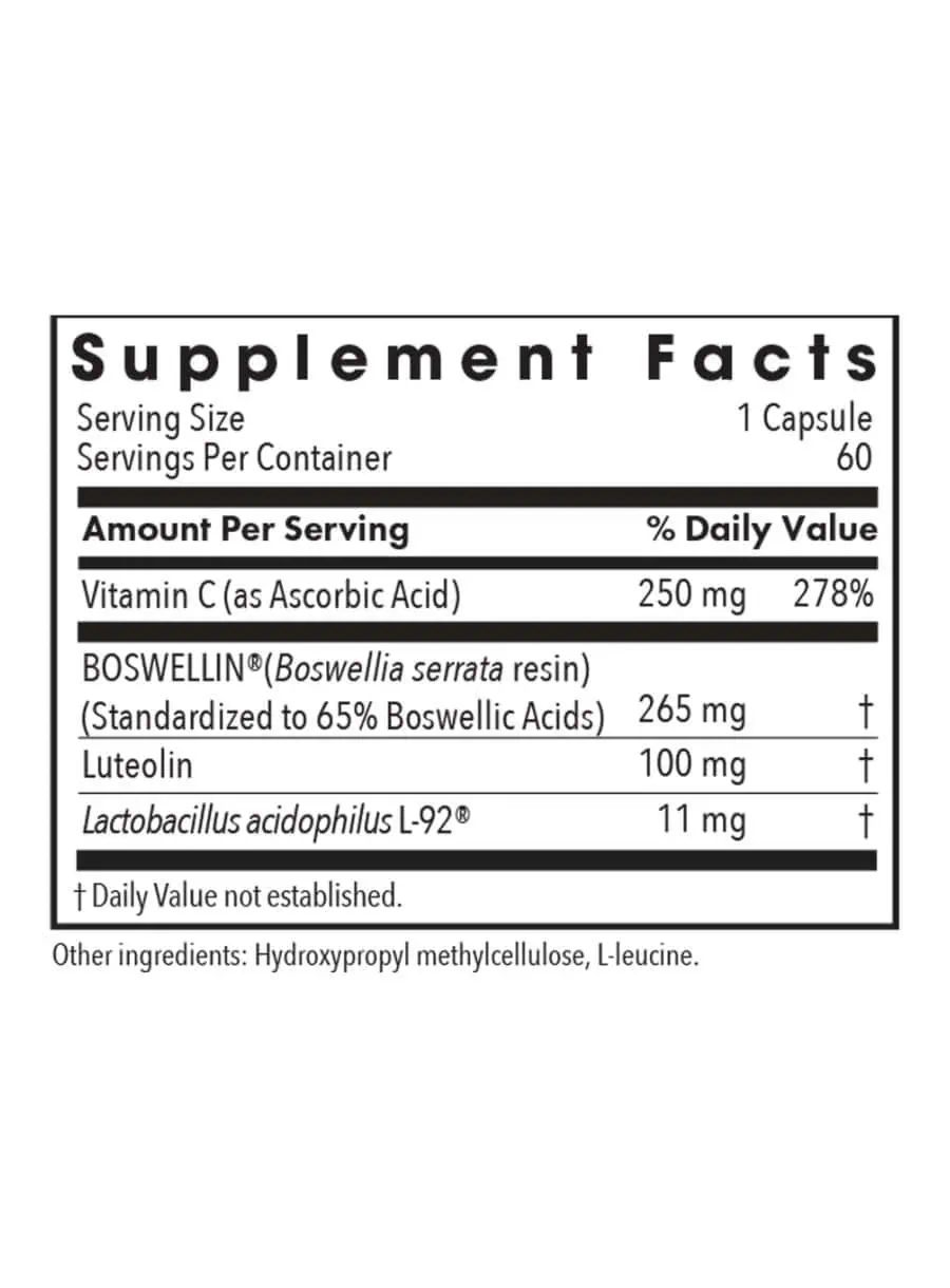 Lactobacillus acidophilus L-92®, a heat-treated postbiotic strain, activates gut immunity and supports balanced Th1/Th2 cytokine responses without the need for live probiotic colonization. Vitamin C enhances immune function and stabilizes mast cells, while Boswellia serrata and Luteolin provide additional support for respiratory health and antioxidant protection.