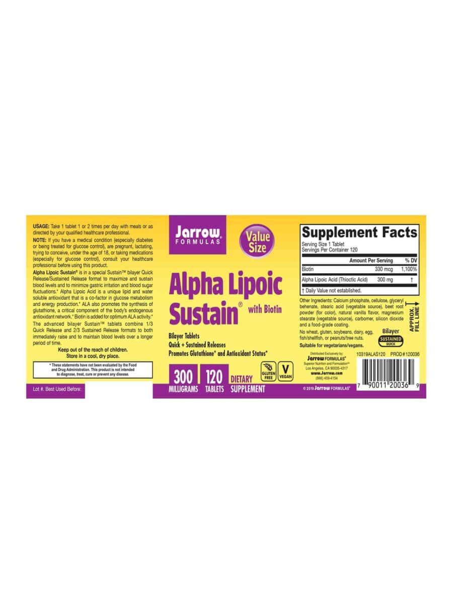 Alpha Lipoic Sustain is a unique supplement designed to promote glutathione and antioxidant status. This advanced formulation features a special Sustain™ bilayer technology that combines quick and sustained release, ensuring optimal blood levels of Alpha Lipoic Acid (ALA) while minimizing gastric irritation and blood sugar fluctuations. ALA is a powerful lipid and water-soluble antioxidant that plays a crucial role in energy production and glucose metabolism. Additionally, Biotin is included to enhance the effectiveness of ALA, making this product ideal for those looking to support their antioxidant defenses and metabolic health.