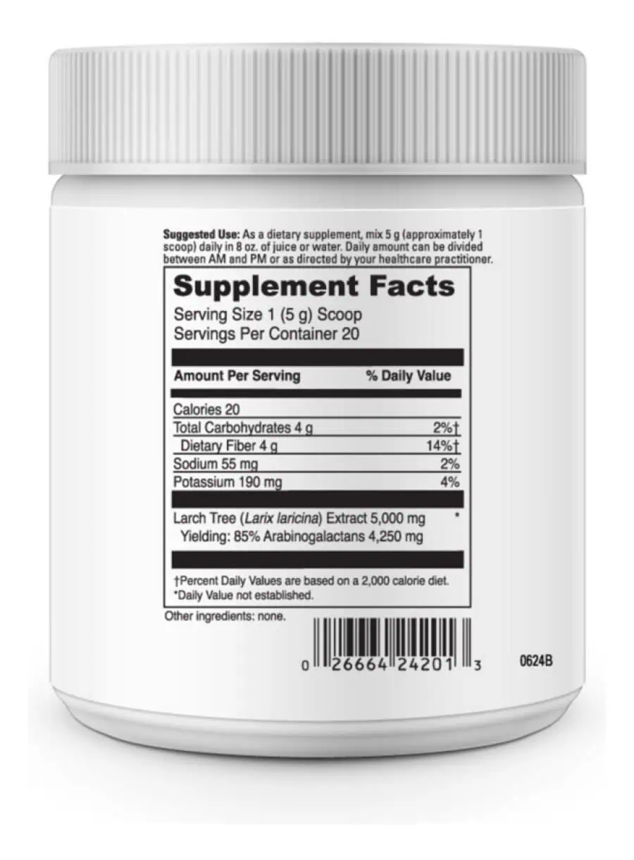 Arabinogalactan Powder — This larch tree supplement is designed to support immune system function and maintain microflora balance in the gastrointestinal (GI) tract. Arabinogalactans, derived from larch trees, are water-soluble polysaccharides that promote the growth of beneficial probiotic bacteria such as Lactobacilli and Bifidobacteria, which are essential for optimal GI health. The Larch Tree Extract powder in this product is ImmunEnhancer™ AG from Larex, Inc.