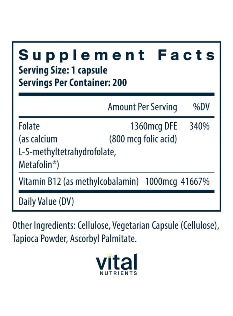 B-12/Methyl Folate 1000mcg/800mcg — This premium vegan formulation combines Vitamin B12 and Folate to support gastrointestinal tract health, promote a healthy nervous system, and help maintain homocysteine levels in the normal range. The methylated forms of B12 (methylcobalamin) and folate (Metafolin L-5-MTHF) are included for optimal bioavailability and physiological activity.