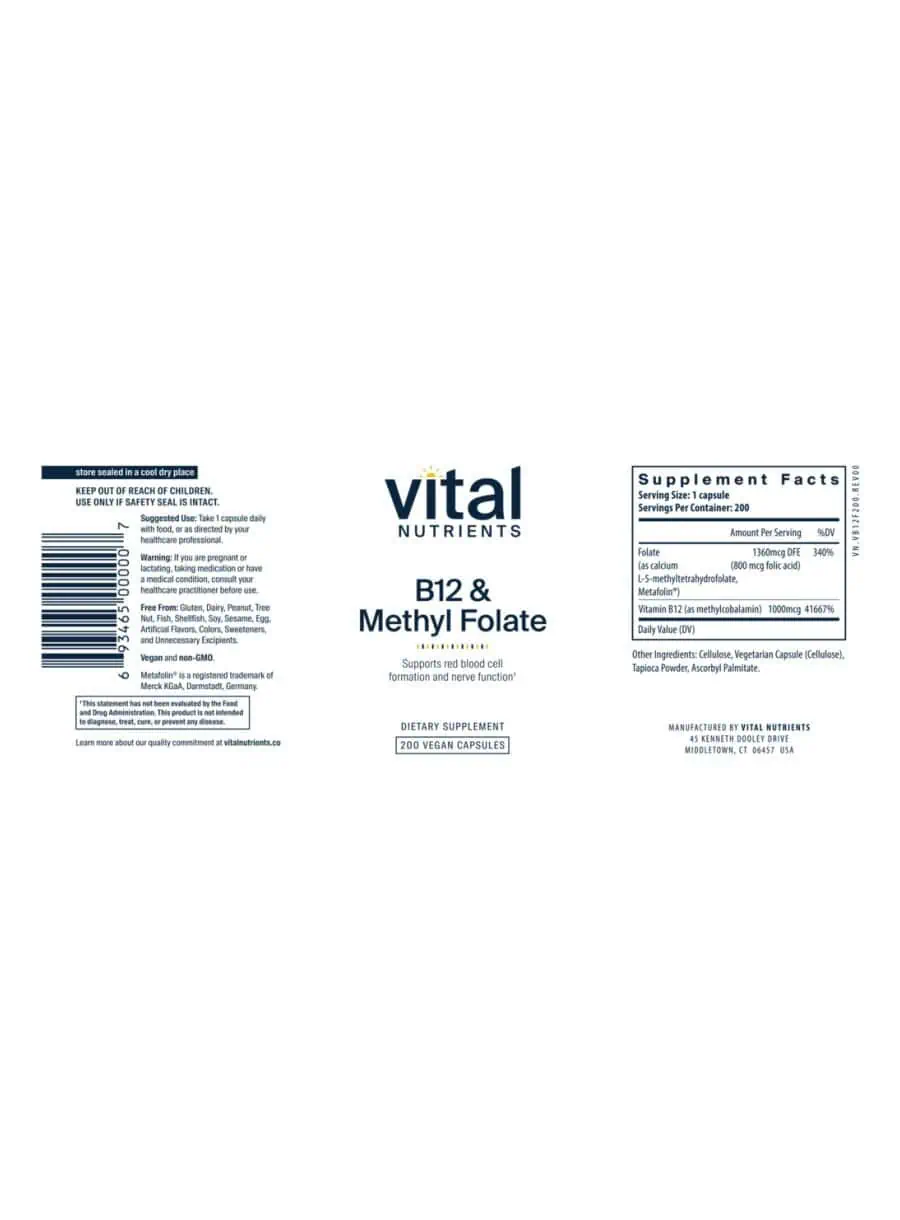 Vitamin B12 and Folate work synergistically to maintain the health of the gastrointestinal tract and nervous system, while also aiding in the metabolism of proteins and fats.