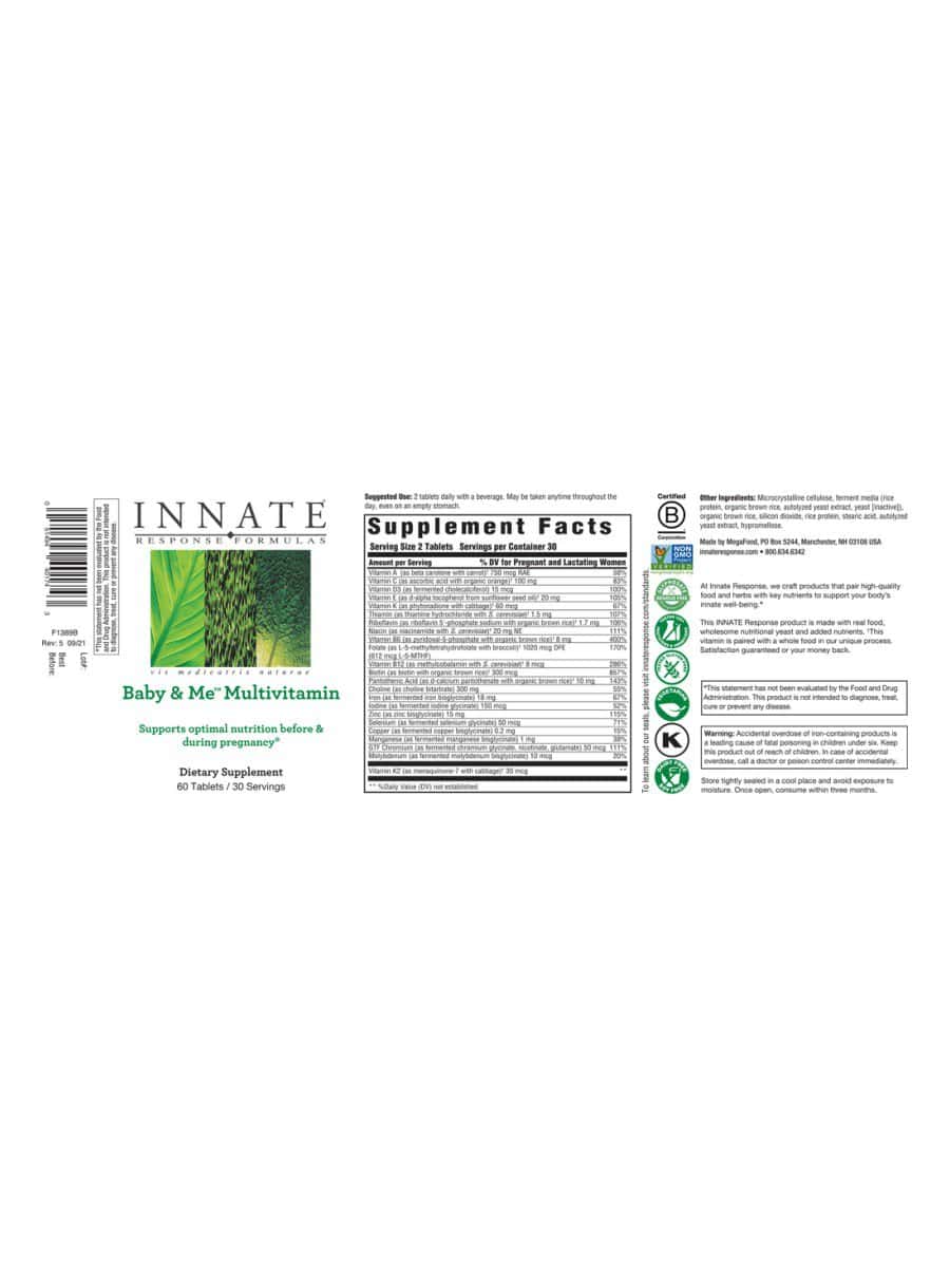 Baby & Me™ Multivitamin is specially formulated to support the health of mothers and their developing babies during pregnancy. This multivitamin contains FoodState® iron to promote healthy red blood cell production, which is crucial during this time. It features the active forms of vitamin B6, methylated folate, and B12, making it suitable for those who prefer these specific forms. Additionally, it includes 600 IU (15 mcg) of vitamin D to support bone health and 600 mcg of methylated folate and choline for fetal health.