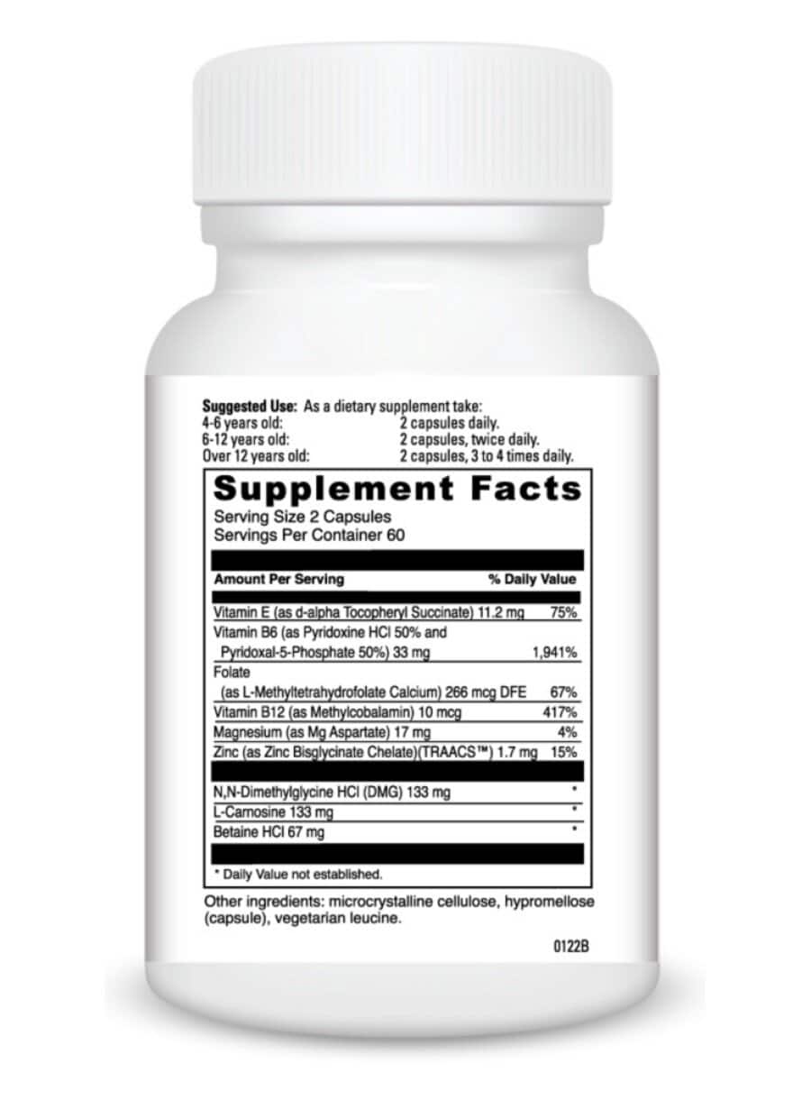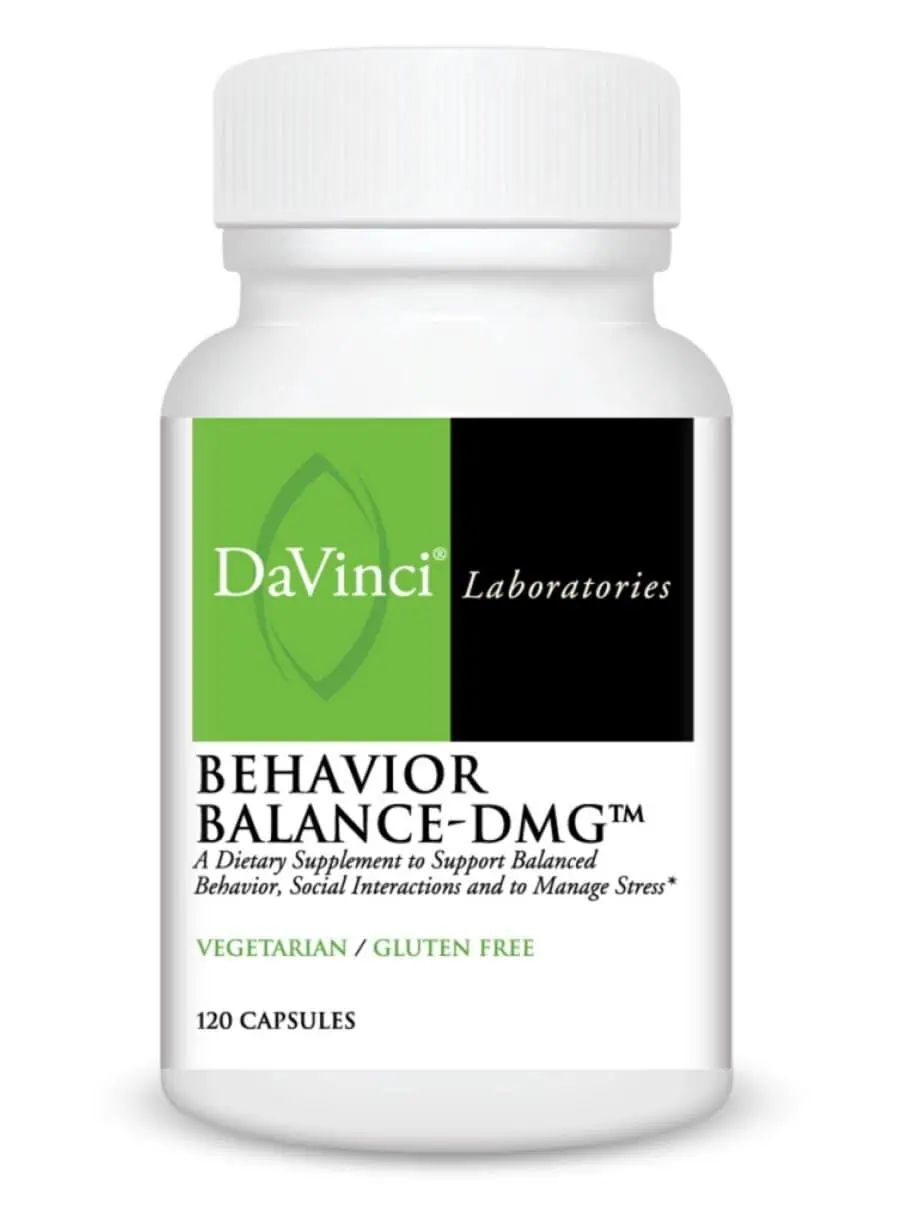 Behavior Balance-DMG — This advanced nutritional supplement combines patented N, N-Dimethylglycine (DMG) with essential nutrients like betaine, folic acid, vitamins E, B6, and B12, l-carnosine, zinc, and magnesium in an easy-to-swallow enteric-coated capsule. These nutrients work synergistically to balance behavior patterns and enhance socialization skills, while also supporting stress coping mechanisms and immune system function.