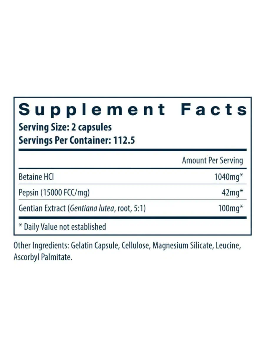BETAINE HCL PEPSIN & GENTIAN ROOT is a combination of nutrients that are beneficial for promoting healthy digestion. Gentian, a wonderful bitter herbal, combined with Betaine HCl maintains a healthy pH in the stomach, supporting protein digestion, mineral absorption, small intestine pH, and B12 absorption.