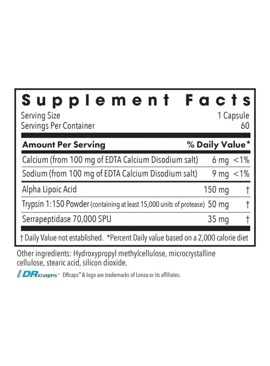 This supplement features Serrapeptidase, a proteolytic enzyme, along with EDTA, which is known for its chelating properties, and alpha lipoic acid, an antioxidant that supports cellular health.