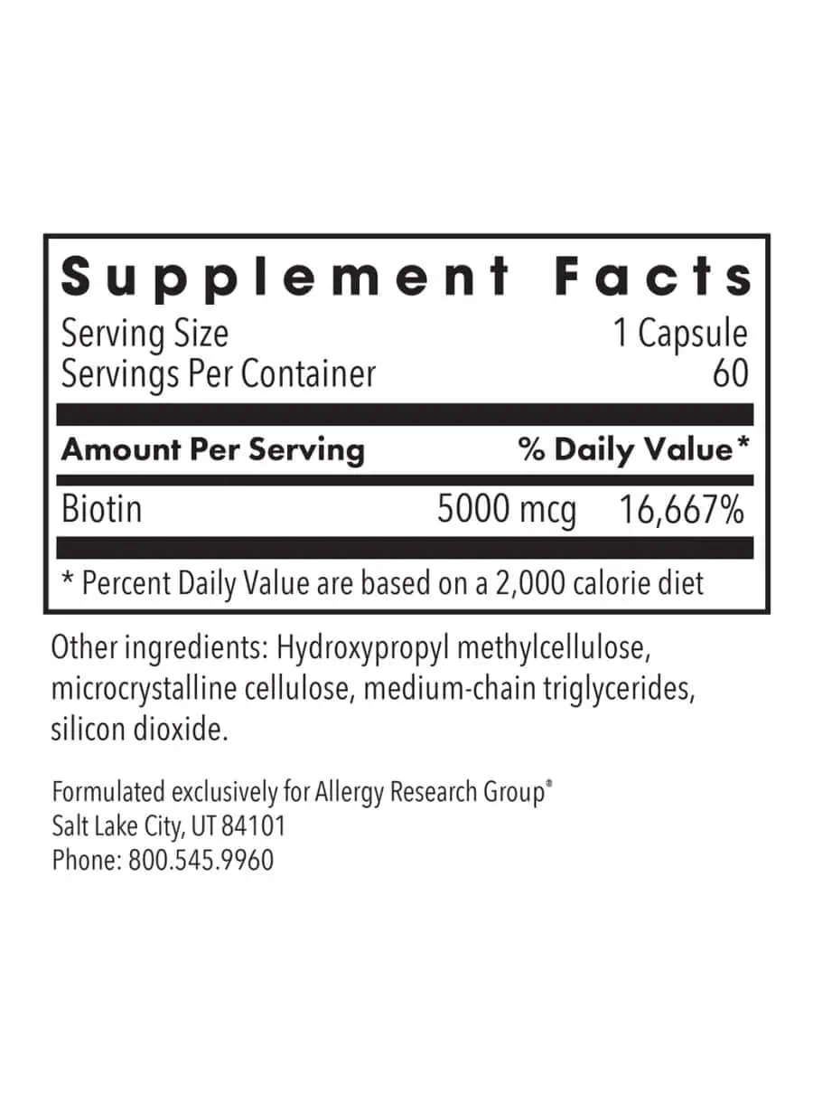 Biotin 5000 — This high potency biotin (vitamin B7) serves as an essential coenzyme for carboxylation reactions, playing a vital role in the metabolism of fats, sugars, and amino acids. It is also crucial for the activation of acetylCoA carboxylase, an enzyme important for the healthy synthesis of myelin. Additionally, biotin supports healthy hair, skin, and nails, making it a great choice for those looking to enhance their beauty regimen.