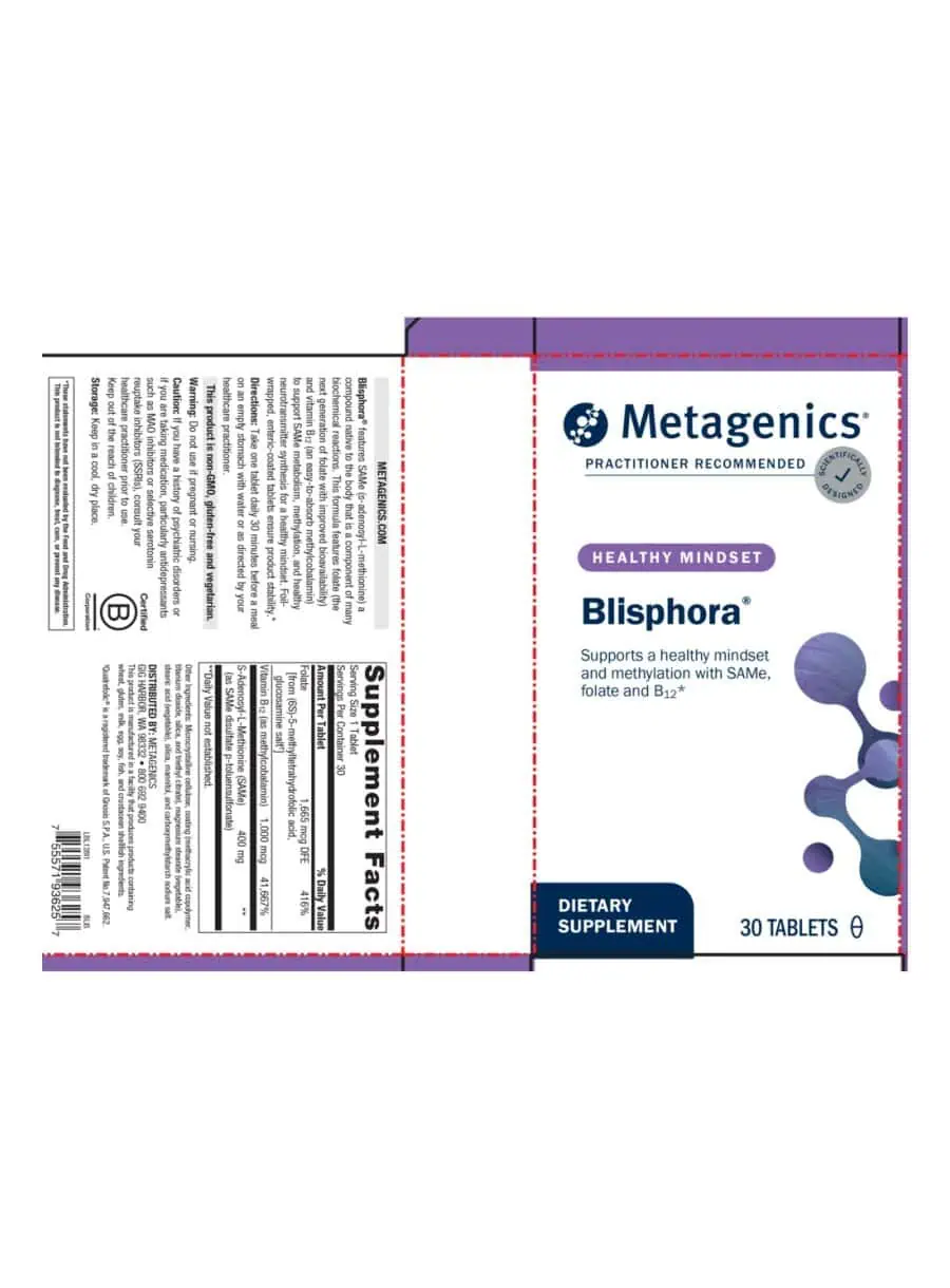 Blisphora® is a revolutionary formula featuring clinically effective levels of SAMe (s-adenosyl-L-methionine), a compound native to the body that is a critical component of many biochemical reactions and plays an important role in supporting positive emotions. This powerful formula combines significant levels of body-ready folate (the next generation of folate with improved bioavailability) and vitamin B12 (as easy-to-absorb methylcobalamin) to support SAMe metabolism, methylation, and healthy neurotransmitter synthesis for a balanced mood. Foil-wrapped, enteric-coated tablets ensure product stability.