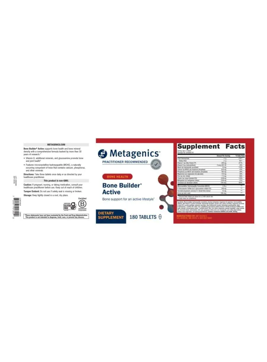Bone Builder® Active — supports bone health and bone mineral density with a comprehensive formula backed by more than 30 years of research. This supplement features Vitamin D, additional minerals, and glucosamine to promote both bone and joint health. It includes microcrystalline hydroxyapatite (MCHC), a naturally occurring component of bone that contains calcium, phosphorus, and other essential minerals.