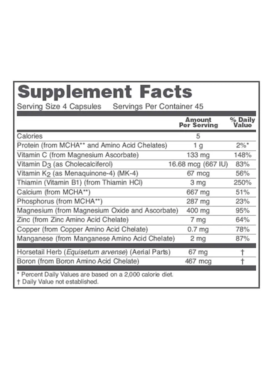 The combination of MCHA, vitamins, and minerals in this formula works synergistically to support bone strength and overall skeletal health. MCHA is particularly known for its high bioavailability, ensuring that the body can effectively utilize the calcium and phosphorus it provides.