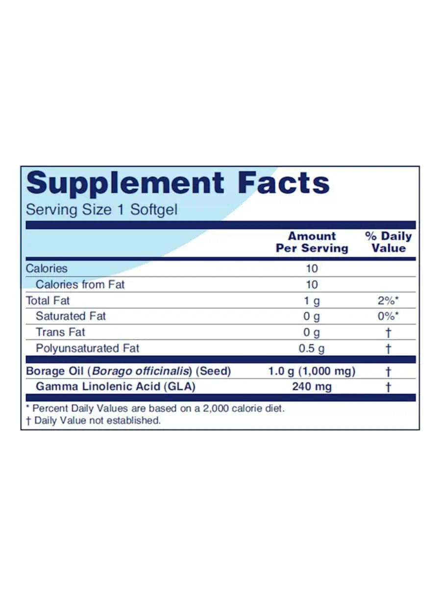 Borage / GLA 1000mg is a premium source of Gamma Linolenic Acid (GLA), a beneficial fatty acid derived from Borage Oil. This product is designed to support normal immune function, maintain skin barrier integrity, and promote a healthy vascular system. With 240 mg of GLA per softgel, it provides a convenient way to enhance your dietary intake of this essential nutrient.