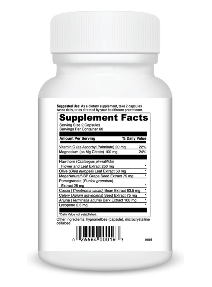 This formulation includes Vitamin C, Magnesium, and various herbal extracts such as Hawthorn and Olive Leaf, which work synergistically to promote cardiovascular health.