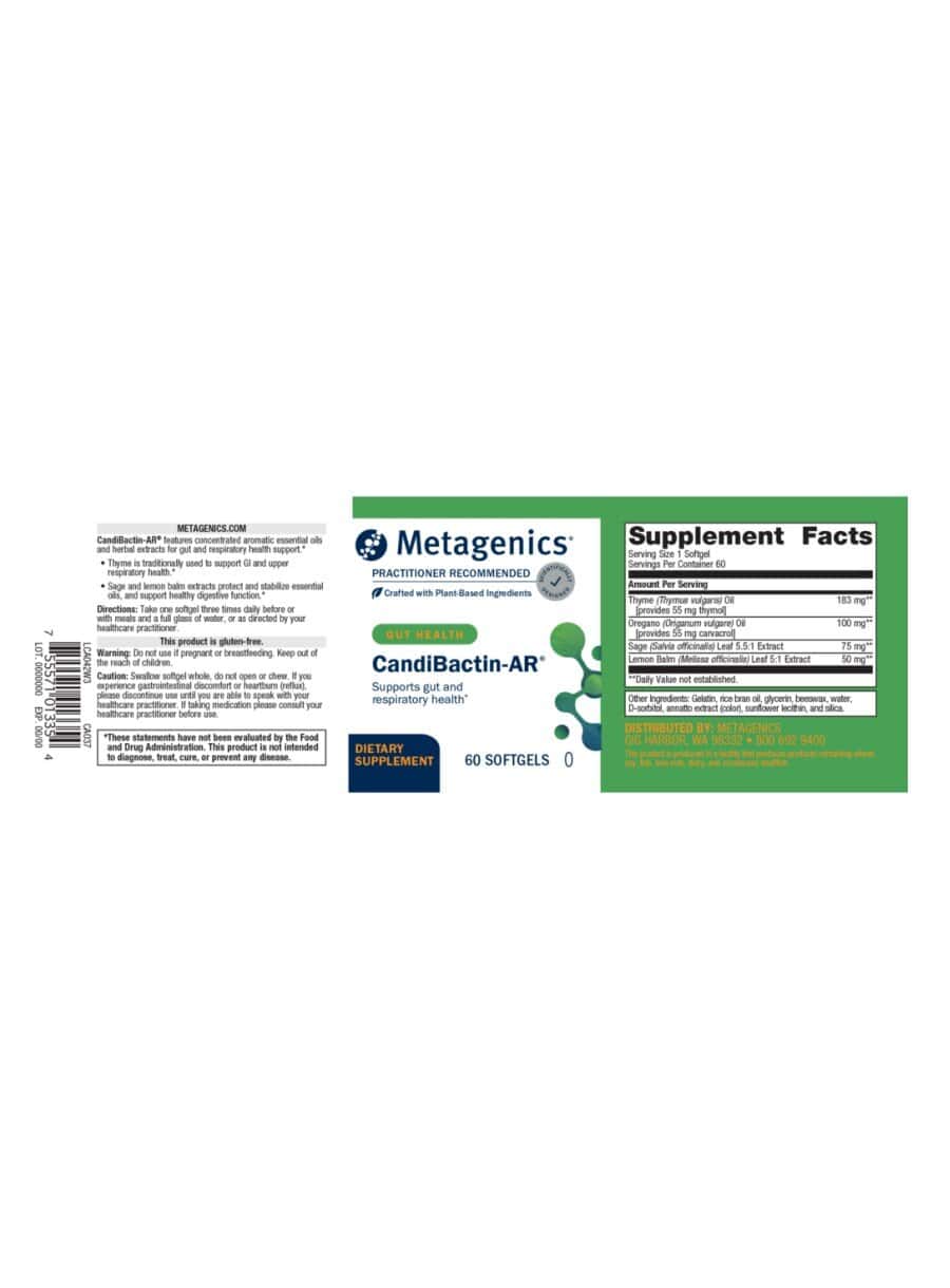 CandiBactin-AR® features concentrated aromatic essential oils and herbal extracts designed to support gut and respiratory health. This supplement combines traditional ingredients like thyme, sage, and lemon balm to promote healthy digestive function and overall wellness.