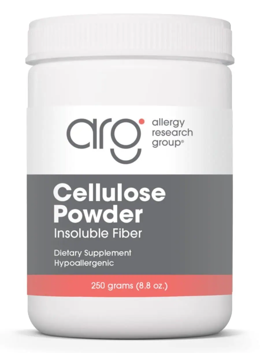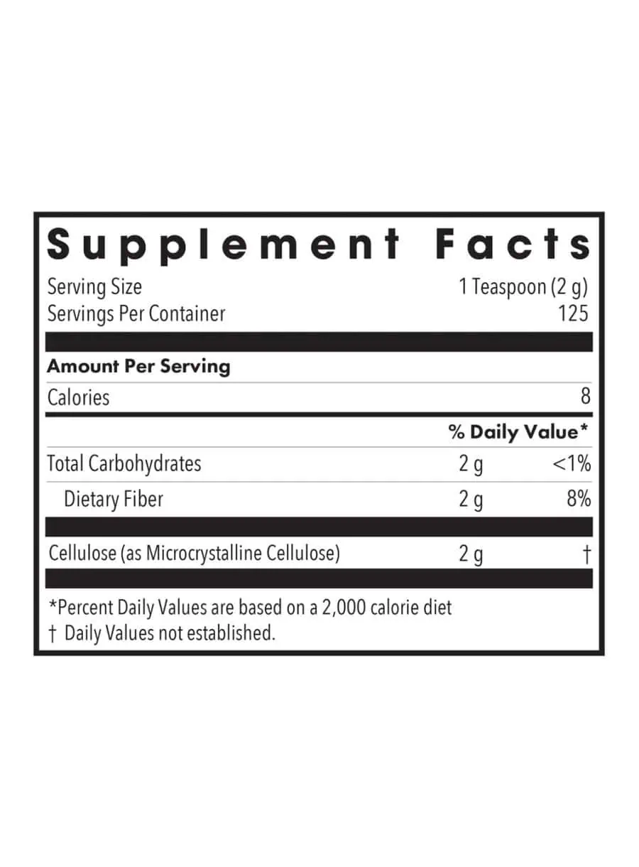 Cellulose Powder — This pure, hypoallergenic powder is an excellent source of insoluble fiber, supporting bowel function without feeding undesirable bacteria. Each serving contains two grams of cellulose with no additional fillers or additives, making it a great choice for those seeking a clean dietary supplement.