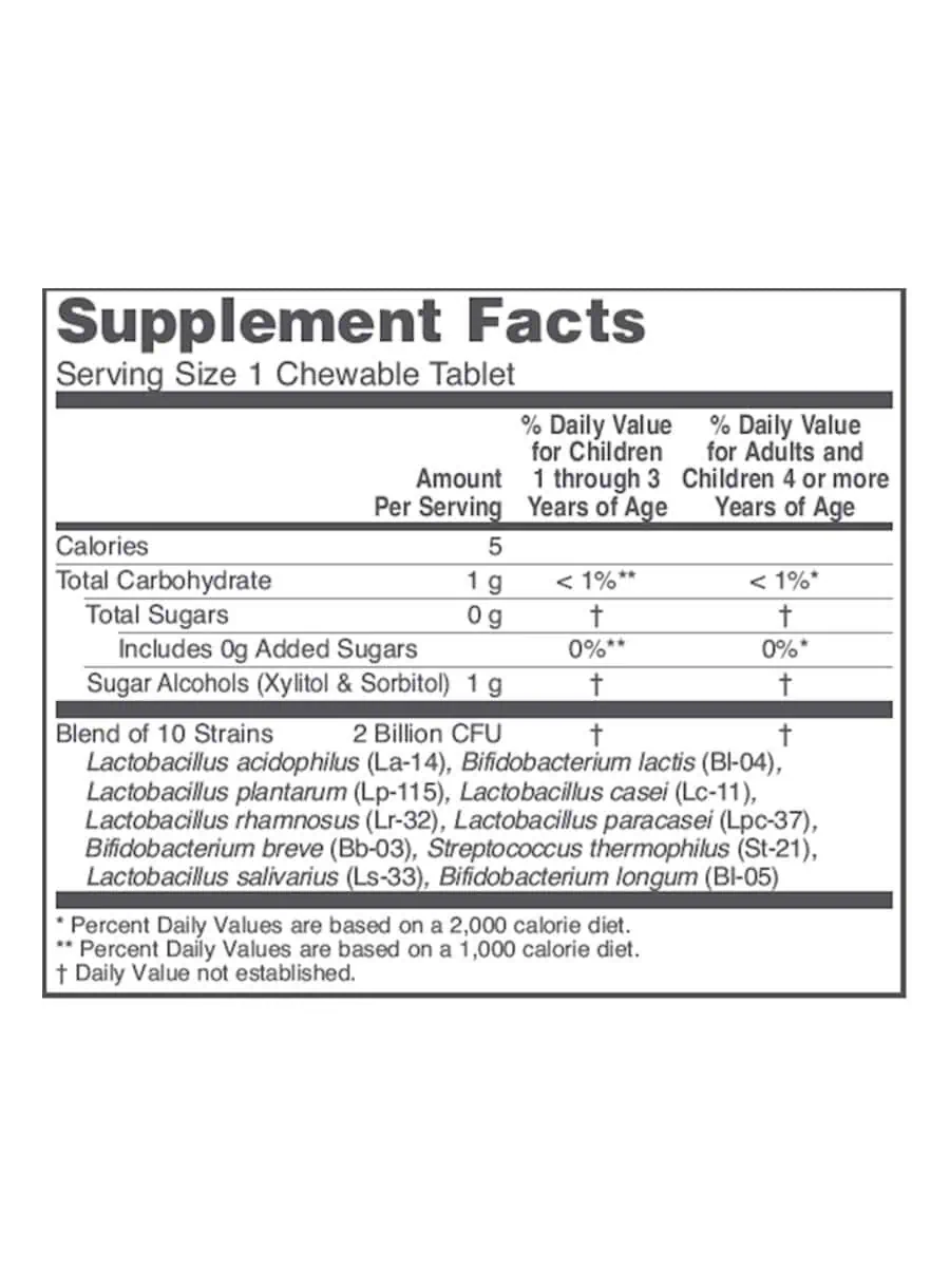 Chewable Probiotic-4 — This great-tasting, chewable probiotic supplement is sweetened with xylitol and designed to support healthy immune system and gastrointestinal functions. With 2 billion CFU from 10 scientifically tested probiotic strains, this product is suitable for both adults and children, making it a versatile addition to your daily health regimen.
