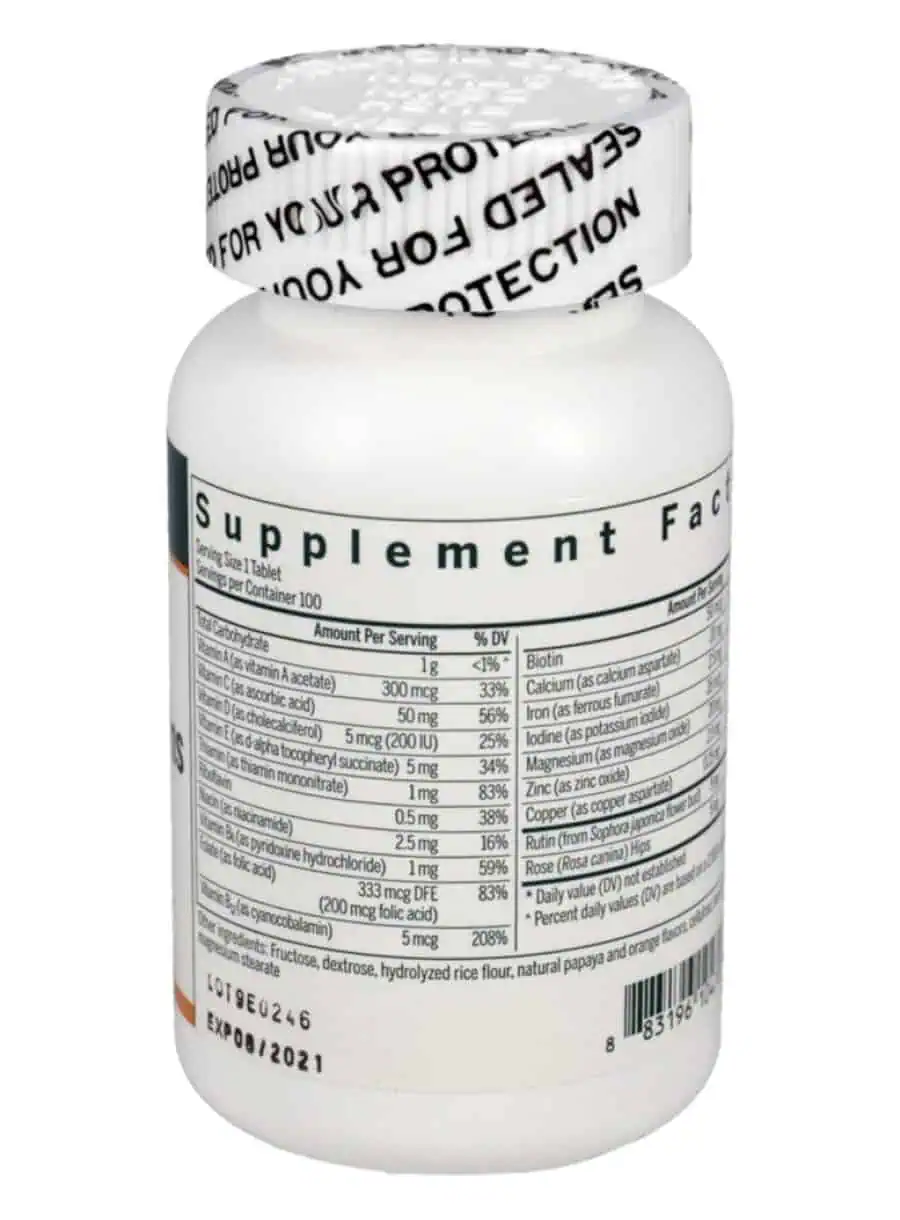 Children’s Chewable — This complete multivitamin and mineral formulation supports children’s normal growth and development. Each chewable tablet is flavored with orange and papaya, making it a tasty option for kids, ensuring excellent patient compliance. Ideal for vegetarians, these convenient chewable tablets provide essential nutrients in a delightful format.