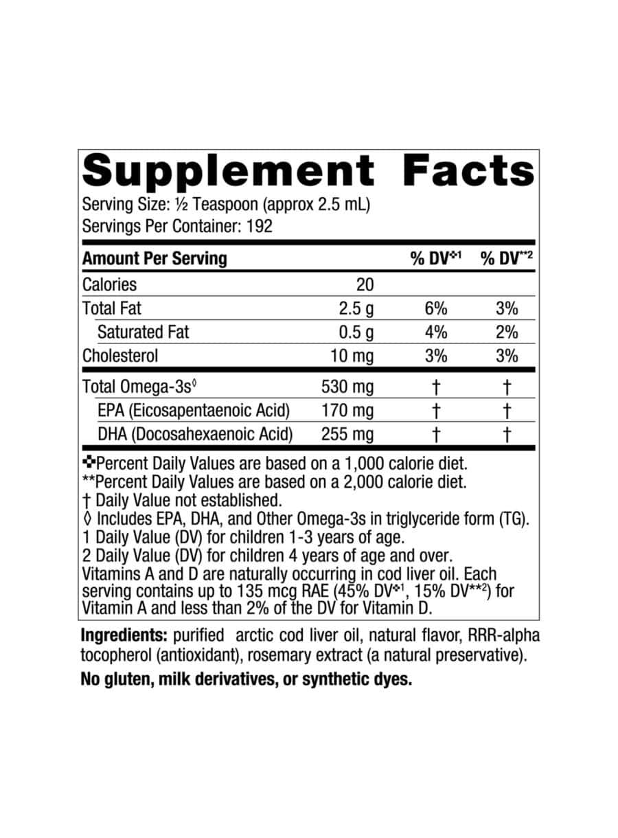 Children’s DHA — This fish oil supplement supports the healthy development of the brain, eyes, and nerves in children ages 1 and older. With 530 mg of omega-3s per serving, it is made from 100% wild arctic cod and is designed to promote learning, cognition, and overall health. The triglyceride form ensures better absorption of critical omega-3s, and its delicious strawberry taste makes it a favorite among kids.