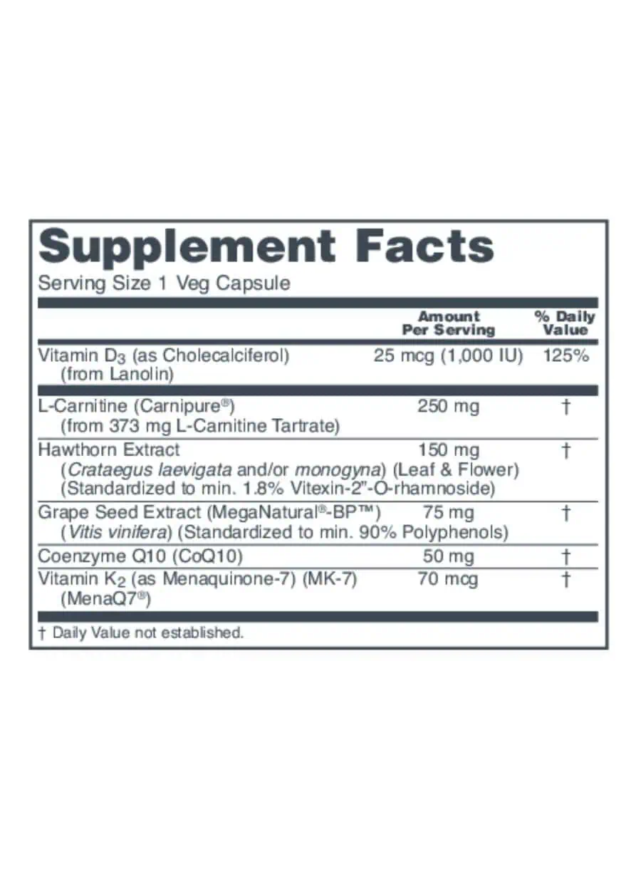 This formula combines essential nutrients and botanicals that work synergistically to support cardiovascular health. L-carnitine aids in energy production, while CoQ10 is crucial for heart function. Hawthorn and grape seed extract provide antioxidant support, and MK-7 contributes to arterial health.