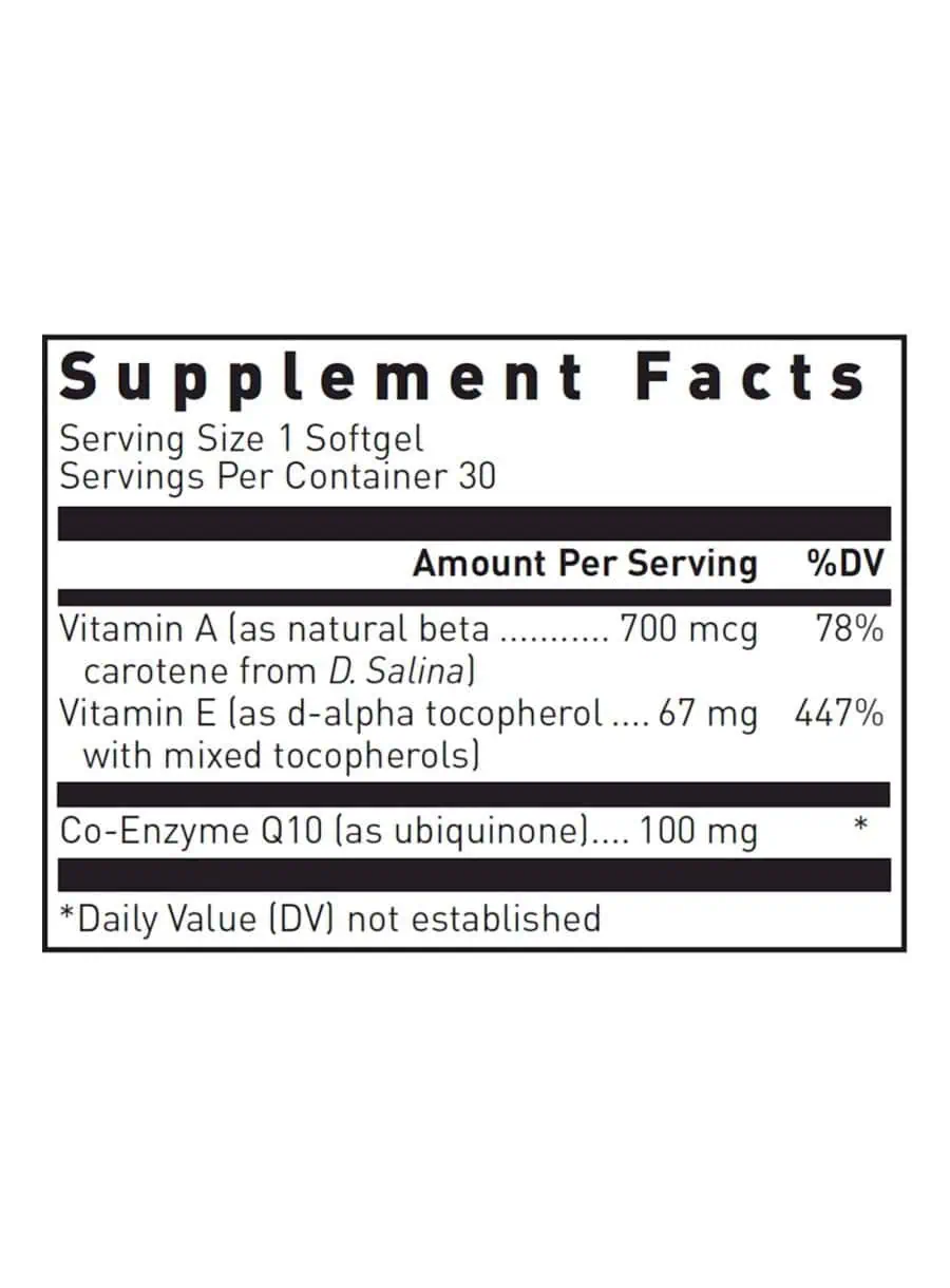 Co-Enzyme Q10 softgels, provided by Douglas Laboratories, contain pure co-enzyme Q10 (ubiquinone). Coenzyme Q10 is solubilized in a base of rice bran oil and vitamin E to enhance absorption of co-enzyme Q10.