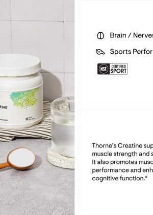 Creatine is a naturally occurring amino acid found predominantly in your muscles and brain, and is also present in foods like meats, eggs, and fish. It plays a vital role in the body’s production of cellular energy by helping to create ATP (adenosine triphosphate), the primary molecule needed for intense physical activities, as well as supplying the energy to power essential functions like heart muscle contraction and brain activity. Thorne’s Creatine – 90 Servings is a premium creatine monohydrate supplement meticulously designed to elevate physical performance and support cellular energy production.