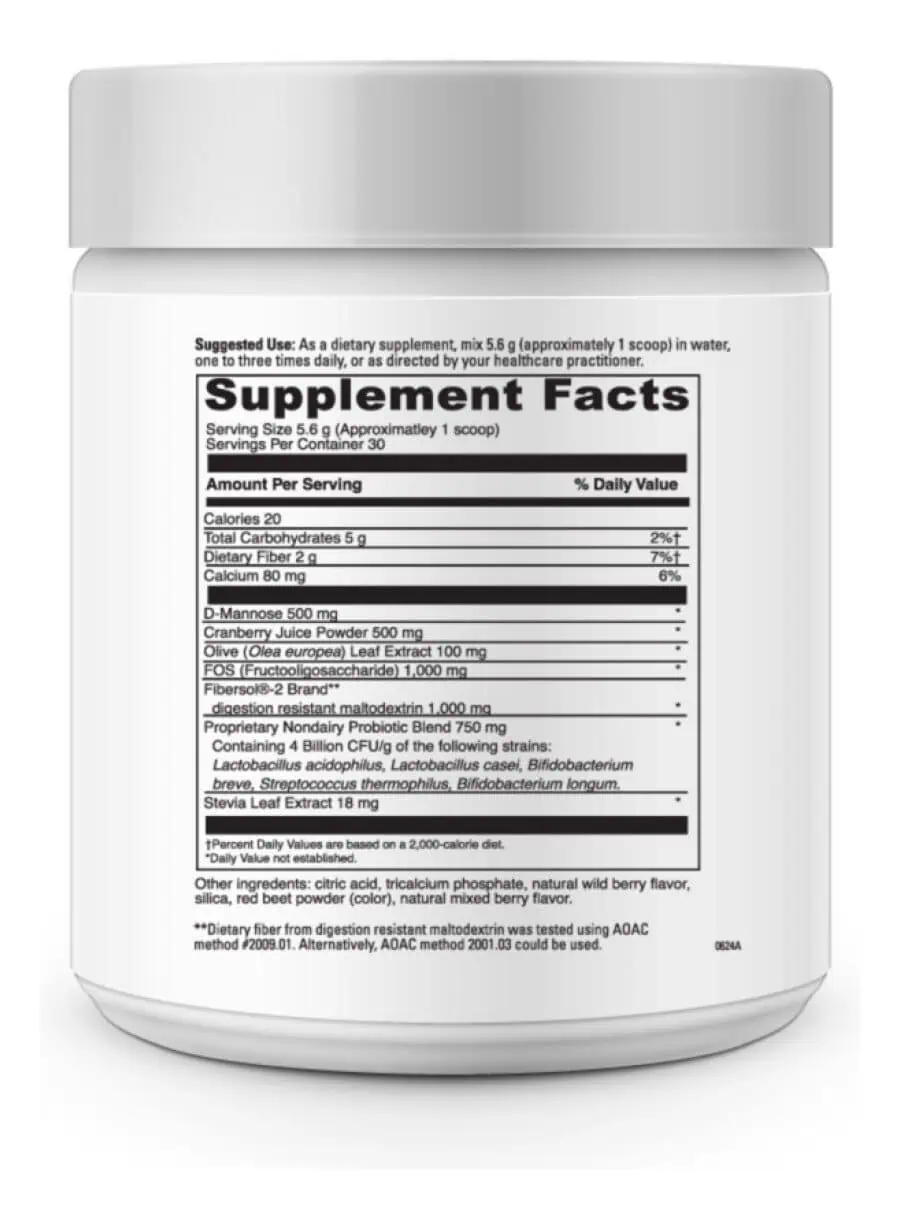 This formula features D-Mannose, a simple sugar that helps maintain urinary tract health, along with Cranberry Juice Powder and a proprietary probiotic blend to support digestive health.
