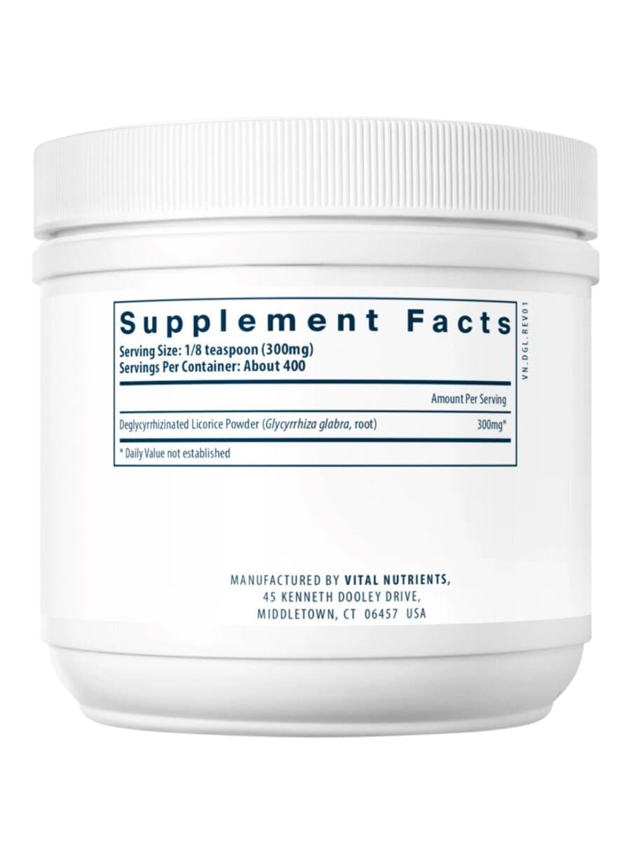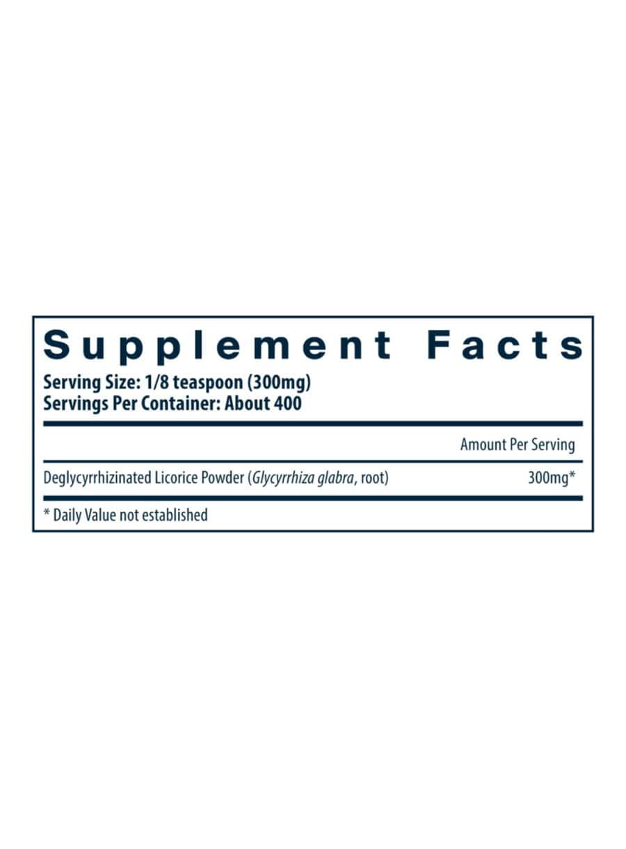 DGL POWDER (deglycyrrhized licorice root) is soothing to, and provides nutritional support for, the gastrointestinal tract.* DGL significantly stimulates the proliferation of mucus secreting goblet cells.* It also aids in maintaining healthy epithelial tissue and helps to maintain normal cell function.*