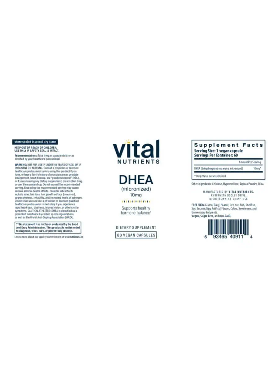 DHEA (micronized) 10mg — This supplement helps maintain healthy energy levels and supports estrogen and testosterone levels already in the normal range. DHEA is a hormone produced by the adrenal glands, and its levels may decline with age, particularly after 30. Supplementing with DHEA can help replenish what our bodies lose over time, supporting healthy aging. It acts as a precursor to androgens and, along with other adrenal hormones, aids in fat, sugar, and mineral metabolism, immune response, and overall energy levels.