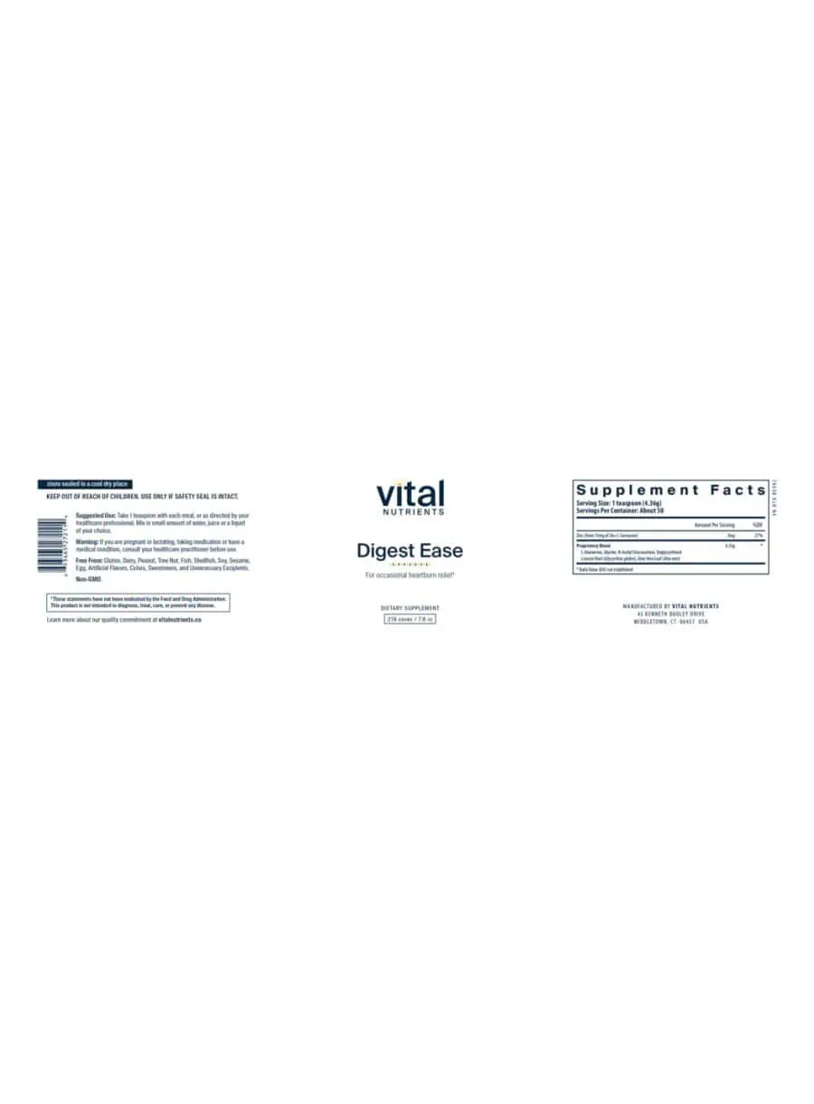 Digest Ease is a combination of herbs and nutrients designed to work synergistically and provide relief of occasional heartburn and indigestion.* This formula supports the soothing of the gastrointestinal tract and helps promote and maintain the integrity of the gastric mucosal lining.*