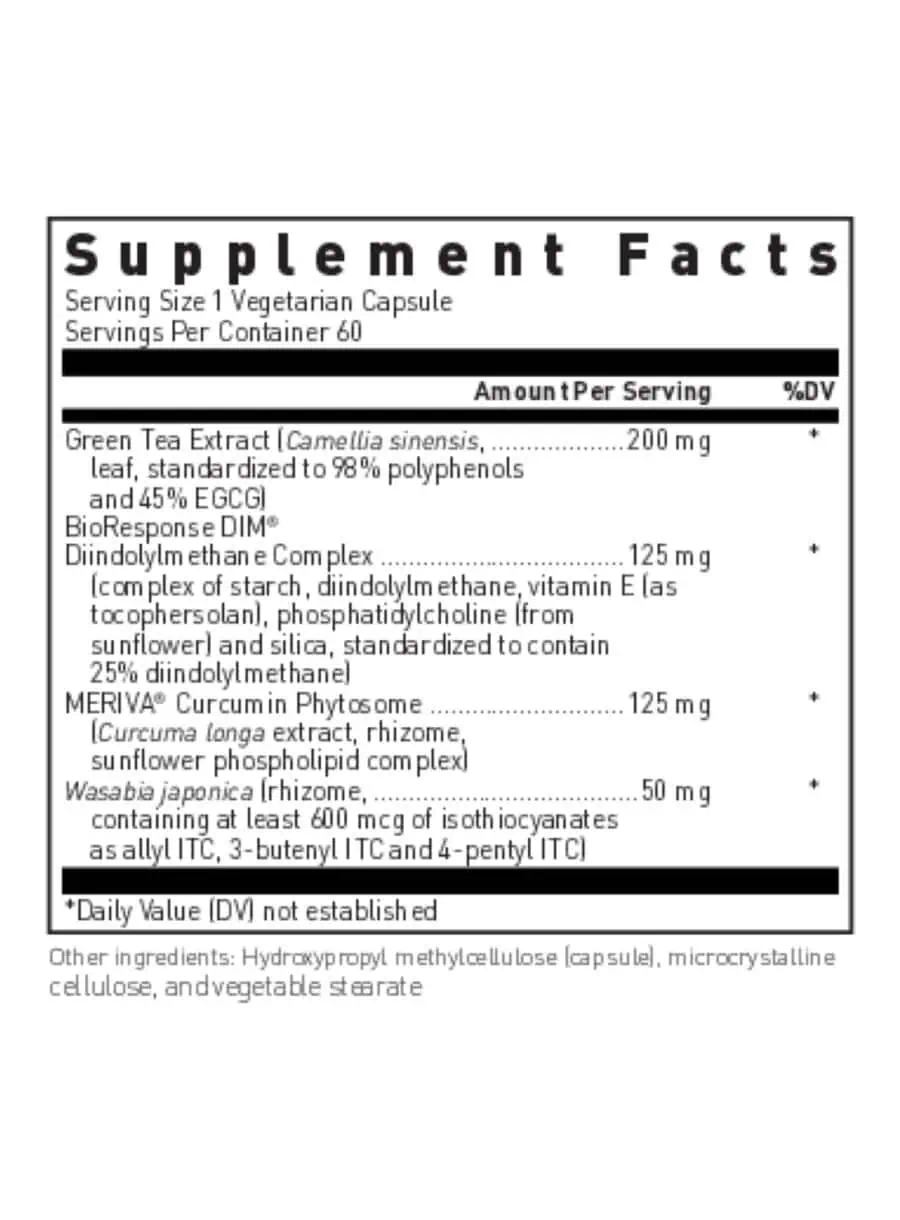 Microencapsulated DIM® is the only diindolymethane with proven absorption and activity demonstrated in independently performed clinical studies. BioResponse DIM® contains pure DIM, microencapsulated in particles complexed with a vitamin E derivative and phospholipids to aid absorption from our intestinal tract. The patented formulation process for making BioResponse DIM® creates microparticles of DIM, emulsifies the DIM with vitamin E and phospholipids, and captures these complexes through a drying process in larger particles of pure food starch. The result is a sustained-release, dry powder which re-dissolves easily after oral consumption.Green TeaScientists have identified numerous phytochemicals including polyphenols, methylxanthines, flavonoids, and triterpenoid saponins in green tea. The polyphenols contained in tea, specifically the catechins, appear to provide the primary health promoting benefits associated with green tea consumption. Catechin, epicatechin, epigallocatechin (EGC), and most notably EGCG, epigallocatechin gallate act as antioxidants and support immune function and liver detoxification. Additionally, in vitro, these nutrients have been shown to support healthy cell growth and division. †