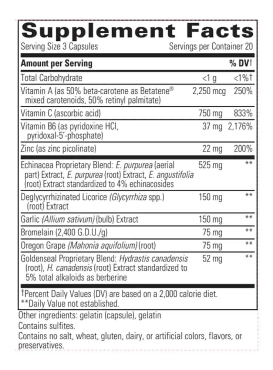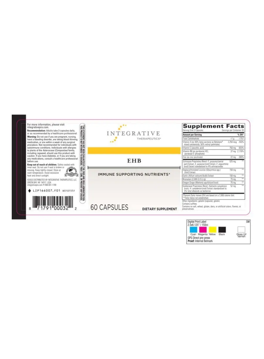 EHB — This advanced immune support formula combines echinacosides, hydrastine, and berberine with high potency vitamins and herbal extracts. Designed for those seeking to enhance their immune function, EHB features a proprietary blend of Echinacea species, Goldenseal, and Oregon grape root, along with garlic, licorice root, and ginger. This product is not intended to diagnose, treat, cure, or prevent any disease.