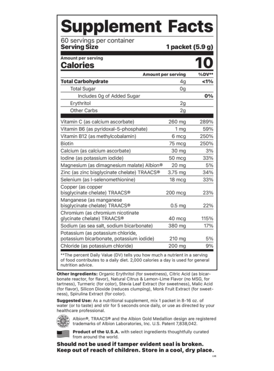 Electrolyte Supreme™ features a balanced combination of key electrolytes and minerals such as calcium, magnesium, zinc, and potassium, along with B complex vitamins in their active forms to enhance energy production and hydration.