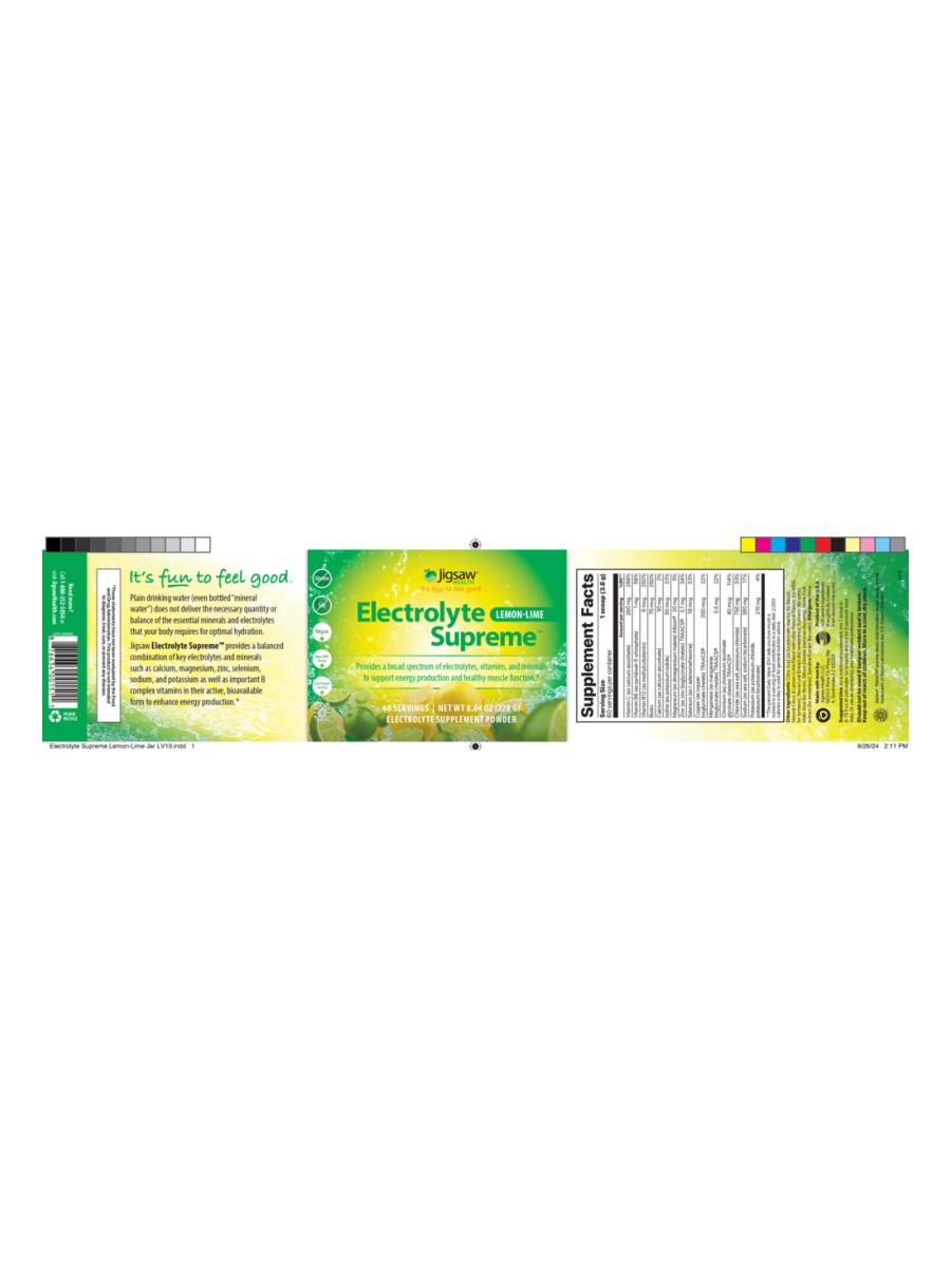 Electrolyte Supreme – Lemon Lime — Jigsaw Electrolyte Supreme™ contains a broad spectrum of electrolytes, minerals, and vitamins in each serving. Replenish and rehydrate your body by adding one scoop of Jigsaw Electrolyte Supreme™ to your water for a refreshing and nourishing energy-boosting beverage.