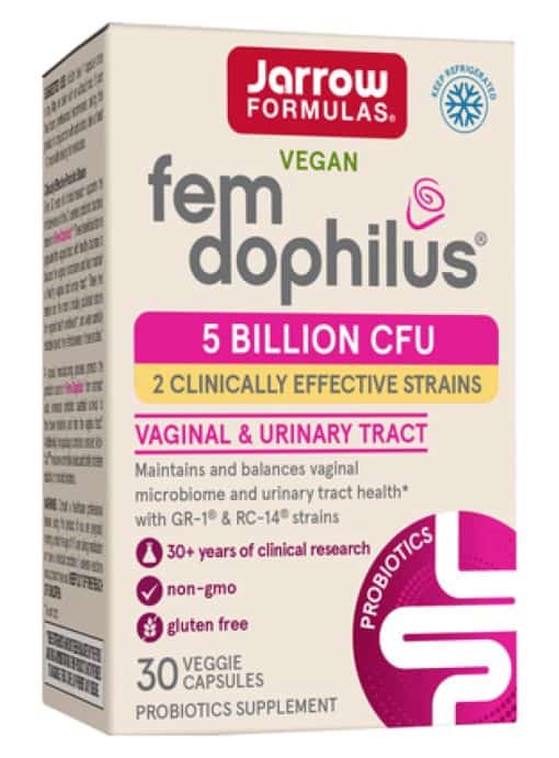 Fem-Dophilus — This probiotic supplement features two patented and clinically documented strains, Lacticaseibacillus rhamnosus GR-1®‡ and Limosilactobacillus reuteri RC-14®‡, developed by renowned researchers Dr. Gregor Reid and Dr. Andrew Bruce. With over 25 years of research backing its efficacy, Fem-Dophilus is designed to support healthy vaginal and urinary tract health. The unique manufacturing process ensures that the probiotic strains are protected from stomach acid, enhancing their survival as they reach the lower intestine.