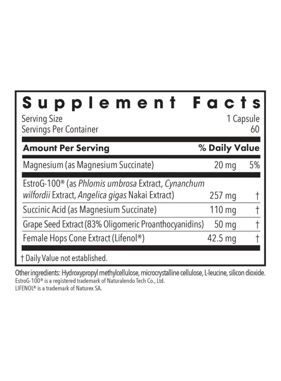 This formula includes EstroG-100®, a clinically studied blend of Phlomis umbrosa, Cynanchum wilfordii, and Angelica gigas, which has been shown to support various menopausal symptoms. Additionally, Lifenol® (Hops Extract) and Grape Seed Extract provide further support for hot flashes and mood stability.