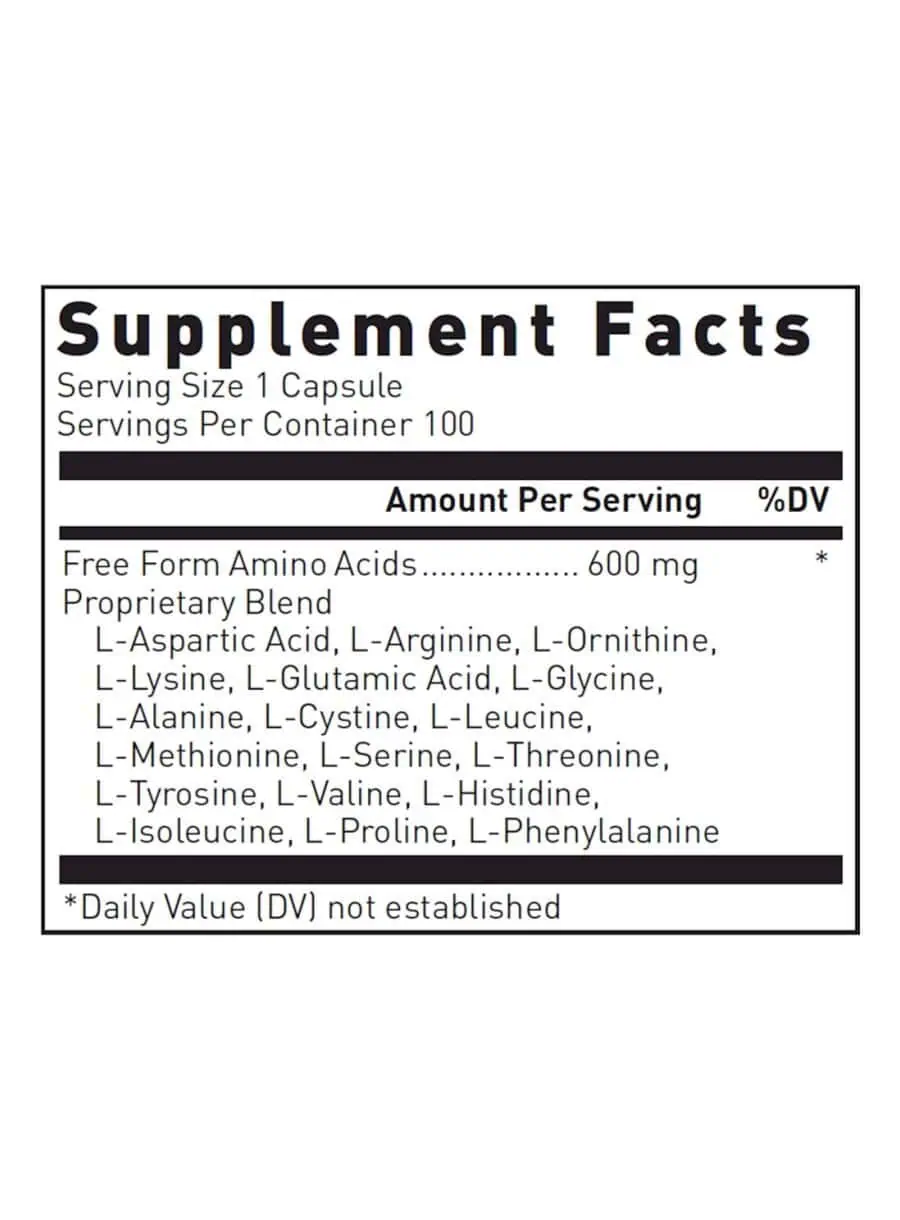 FREE FORM AMINO CAPS contains a proprietary blend of amino acids, including L-Arginine, L-Glutamic Acid, L-Lysine, and L-Phenylalanine, among others. These amino acids play critical roles in protein synthesis, energy production, and the maintenance of various bodily functions. The L-crystalline forms of these amino acids ensure optimal absorption and utilization by the body, helping to balance plasma amino acid levels and support metabolic processes.