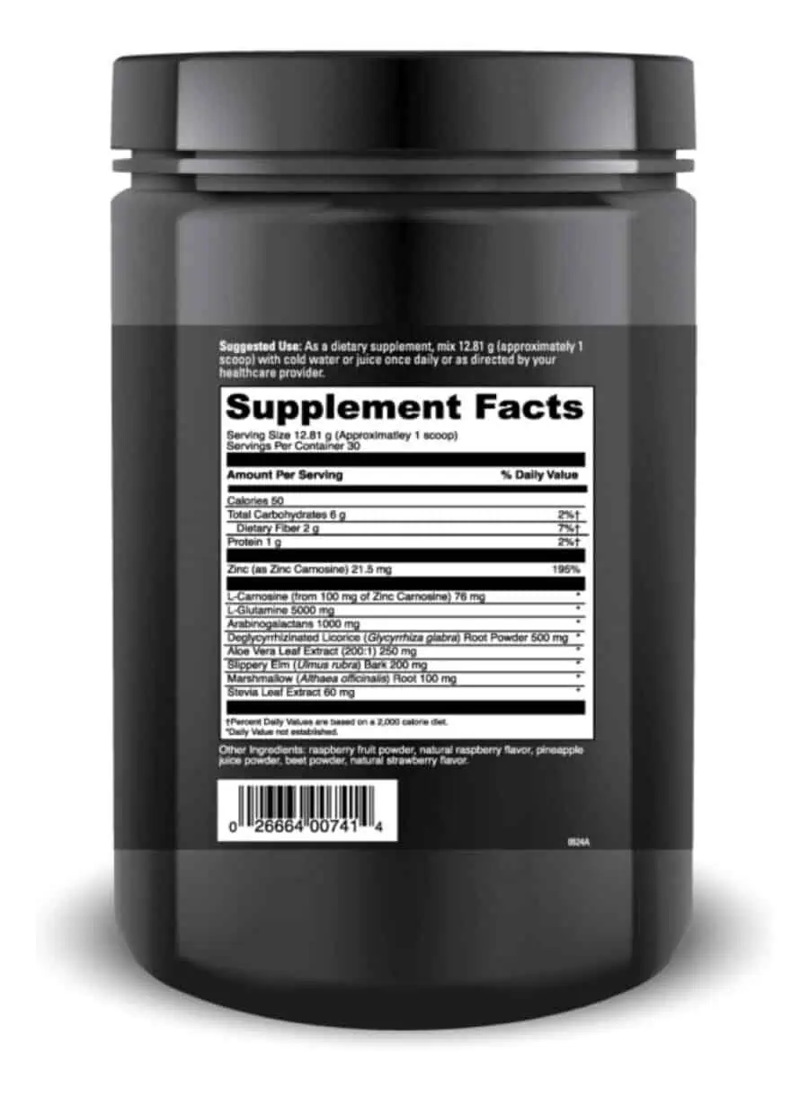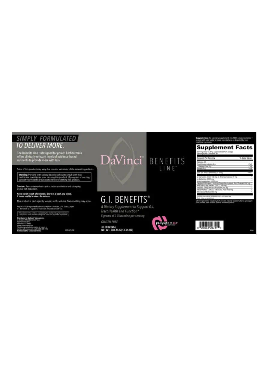 • G.I. Benefits ® is the only formula of its kind to combine: m L-Glutamine at 5000 mg per serving to fuel intestinal cells and maintain villi* m Arabinogalactans at 1000 mg per serving to support the immune system, aid regularity and support the production of beneficial bacteria* m Deglycyrrhizinated Licorice (Glycyrrhiza glabra) Root (DGL) at 500 mg per serving to help soothe the gut wall* m N-Acetyl Glucosamine at high levels (250 mg per serving) to support the integrity of the mucosal lining* m Aloe Vera Leaf Extract (200:1) at 250 mg to support the body’s ability to heal the lining of the stomach and keep the folds and pockets of the colon free of toxic material that gather there* m Slippery Elm (Ulmus rubra) Bark at 200 mg per serving to reduce bowel transit time; absorb toxins from the bowel; increase fecal bulk and enhance beneficial bacteria in the gut* m PepZinGI ® is a unique, patented form of elemental Zinc bound to L-Carnosine. It has been shown to help stabilize small bowel integrity, promote a healthy stomach lining and environment, support the health of gastric cells, maintain a healthy Gastro Intestinal environment, and relieve occasional gastric discomfort.* The proprietary chelation process along with excellent scientific research (over 100 scientific studies, including at least 38 clinical trials) make PepZinGI ® your best choice for supporting gastric health.*