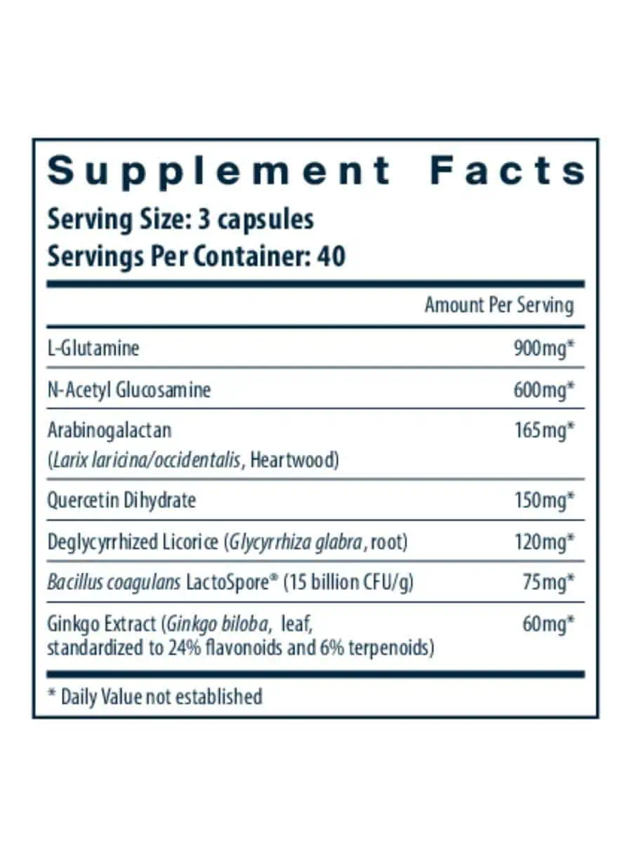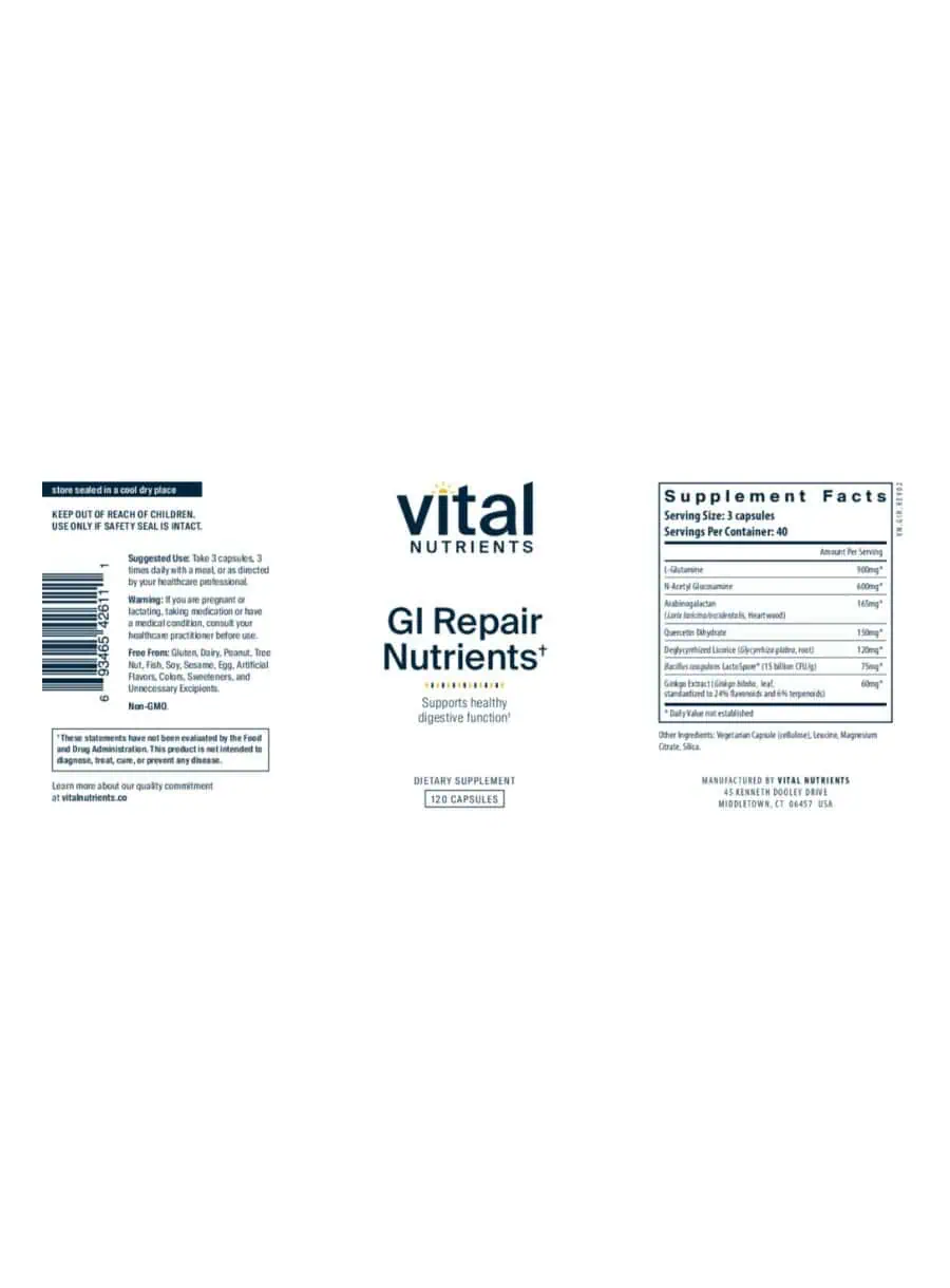 GI REPAIR NUTRIENTS supports the growth and health of the gastrointestinal lining.* These constituents augment the strength of the intestinal mucosal lining.* It is recommended to combine this product with Acidophilus/Bifidobacter/FOS for extra support.* If necessary, combine with higher doses of Glutamine (Glutamine Powder or Glutamine 850mg).*