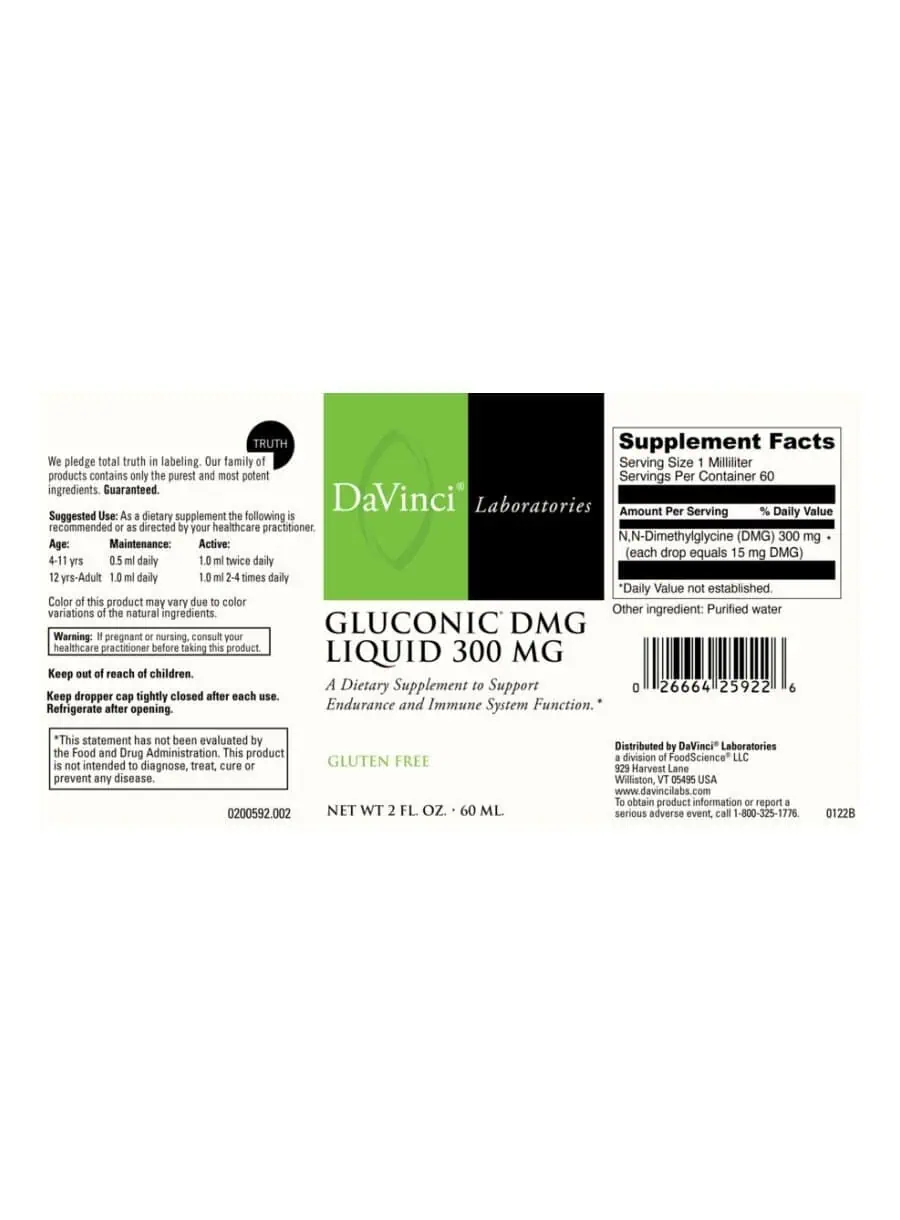 Gluconic DMG-300 Liquid — A dietary supplement designed to support immune system, circulatory, cardiovascular, and neurological functions, as well as muscle recovery and endurance. Dimethylglycine (DMG) is a nutrient found in the cells of both plants and animals, and the human body produces it in very small amounts. Supplementing with higher levels of DMG enhances the nutritional environment of the cell, supporting immune function and improving oxygen utilization at the cellular level. DaVinci Laboratories of Vermont has been awarded three U.S. Patents for N, N-Dimethylglycine’s value and use in improving immunity and benefiting cellular processes. DMG also reduces lactic acid buildup in muscles, shortening recovery time after strenuous exercise and enhancing endurance.