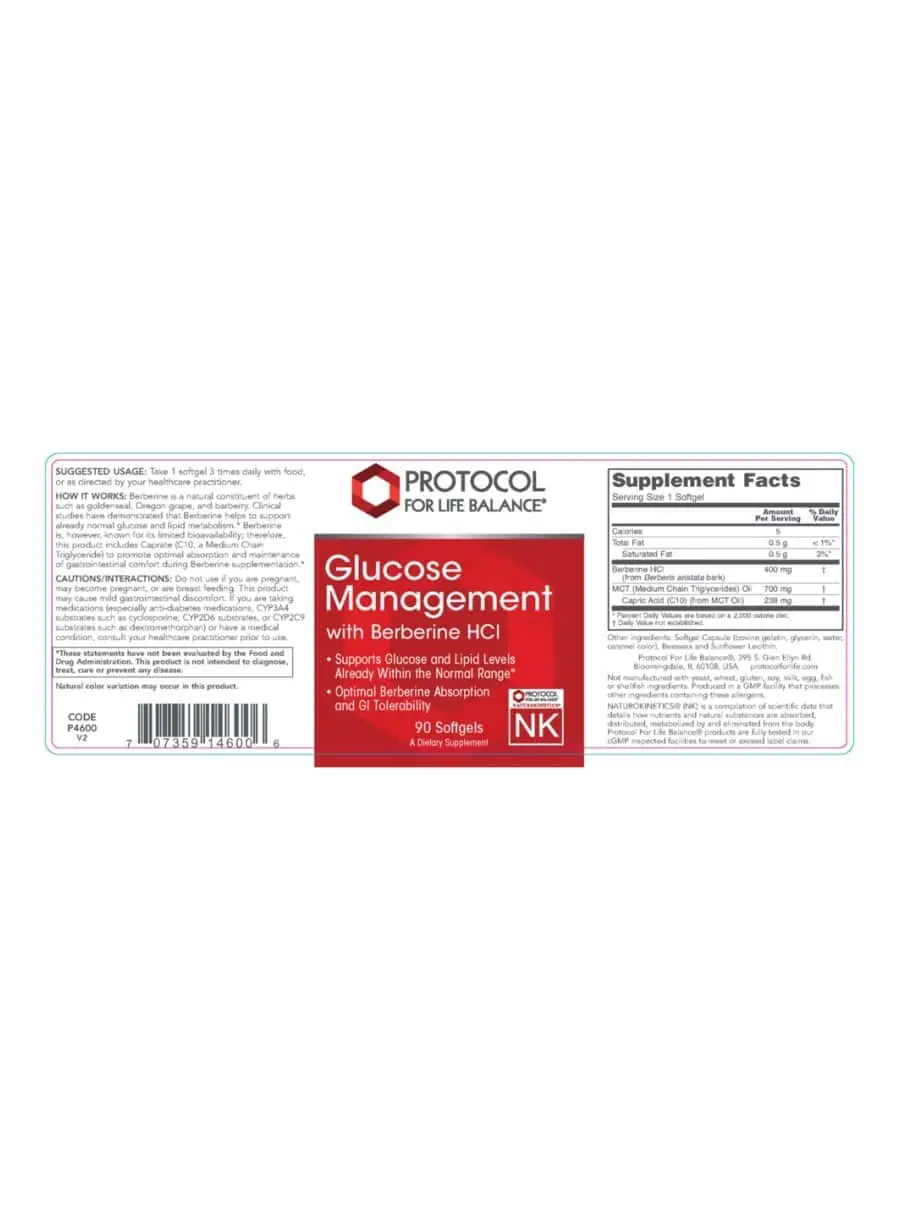 Glucose Management w/ Berberine HCL — This supplement features Berberine, a natural compound found in herbs like goldenseal and barberry, known for supporting normal glucose and lipid metabolism. To enhance absorption, it includes Caprate (C10), a Medium Chain Triglyceride, ensuring gastrointestinal comfort during supplementation. Protocol For Life Balance® products are rigorously tested in cGMP facilities to meet or exceed label claims.