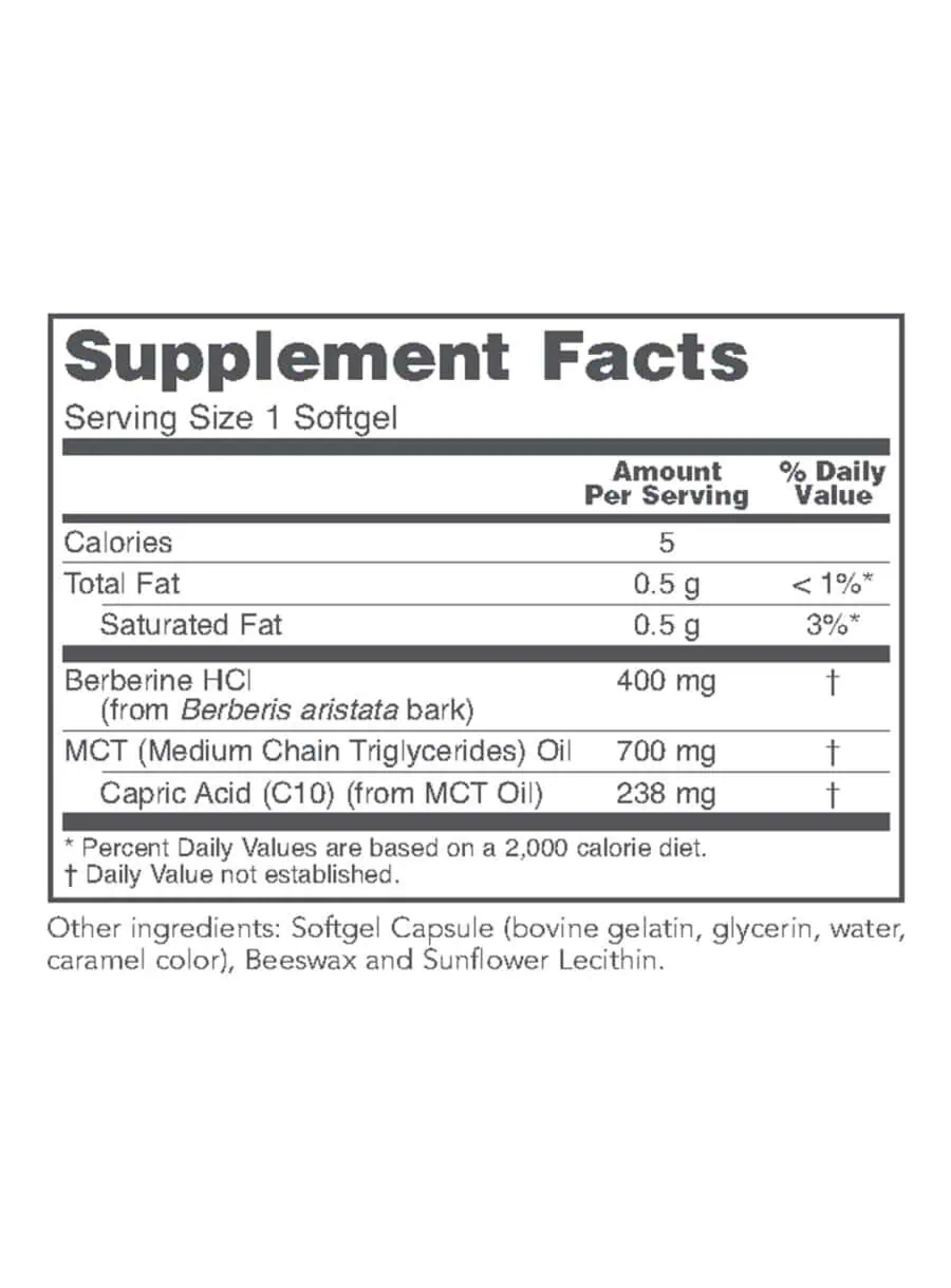 Berberine HCl is the primary active ingredient, derived from Berberis aristata bark, and is complemented by MCT oil to improve bioavailability.