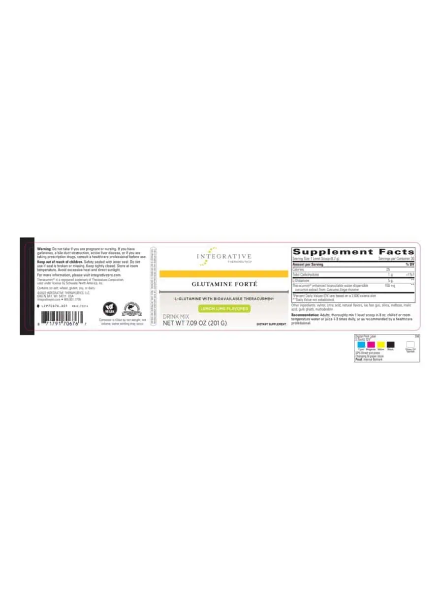 Glutamine Forté is an advanced nutritional supplement that provides a therapeutic, 5-gram dose of the amino acid L-Glutamine in combination with Theracurmin®, a novel, water-dispersible form of turmeric with dramatically enhanced curcumin bioavailability. This convenient and great-tasting lemon-lime flavored drink mix is designed to improve compliance while providing powerful support for gut barrier function, immune health, and tissue repair.