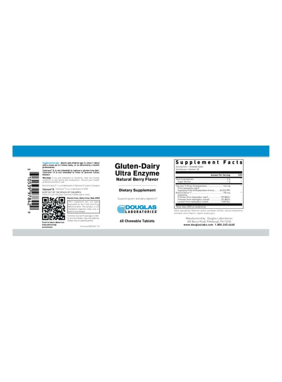 Gluten-Dairy Ultra Enzyme — This advanced enzyme formula is designed to support the digestion of gluten and lactose, making it ideal for individuals with sensitivities. Featuring clinically researched enzymes like Tolerase® G and BioCore Dairy®, this supplement aids in breaking down gluten and lactose into their basic components, promoting digestive comfort.